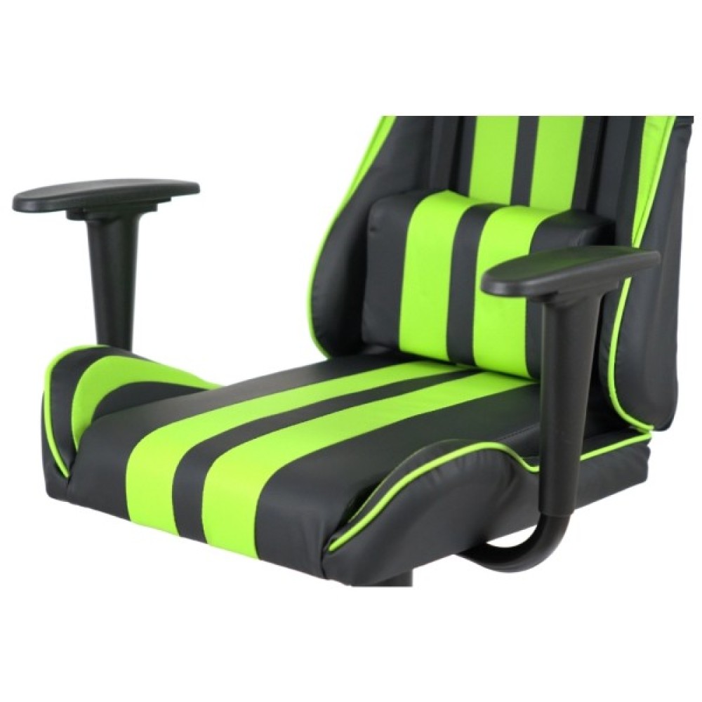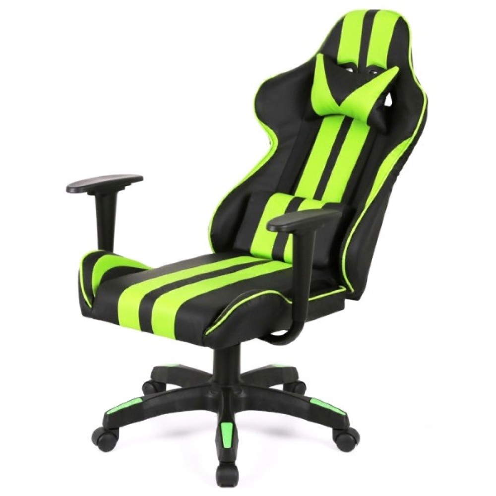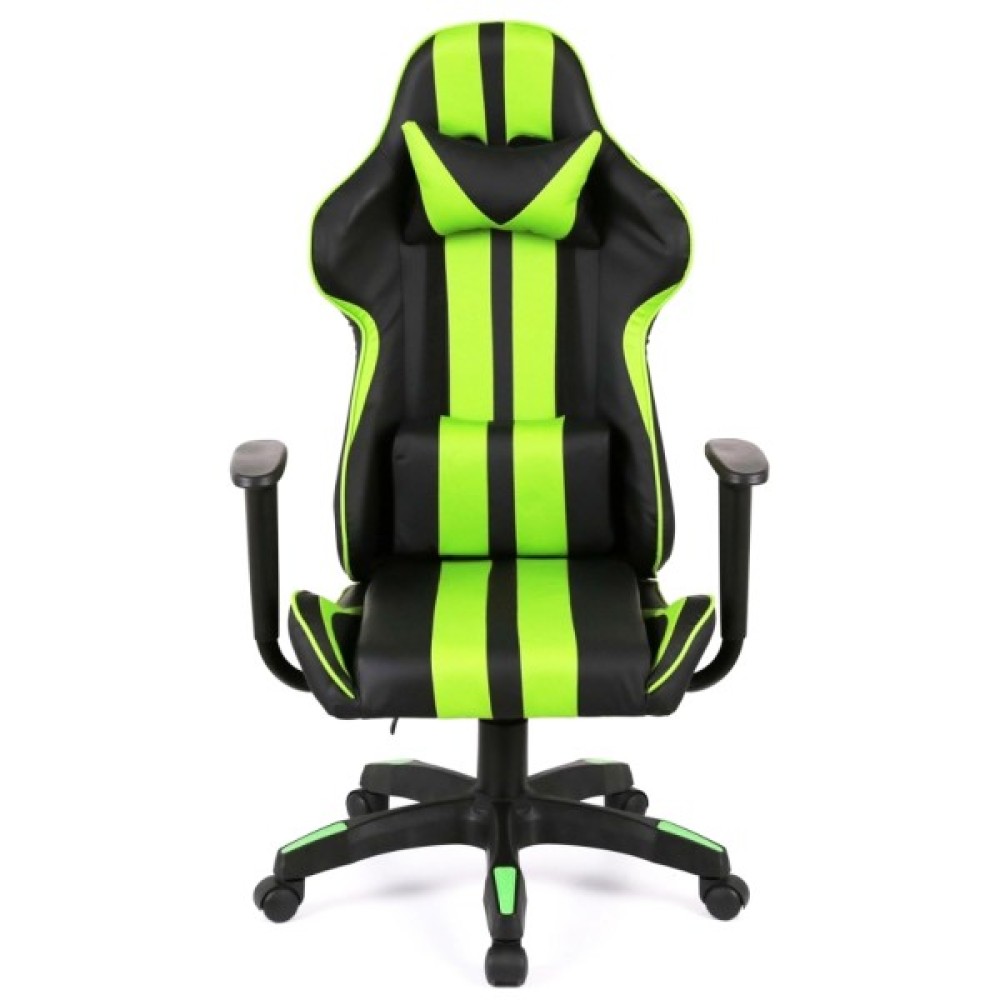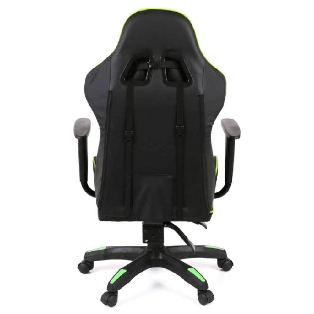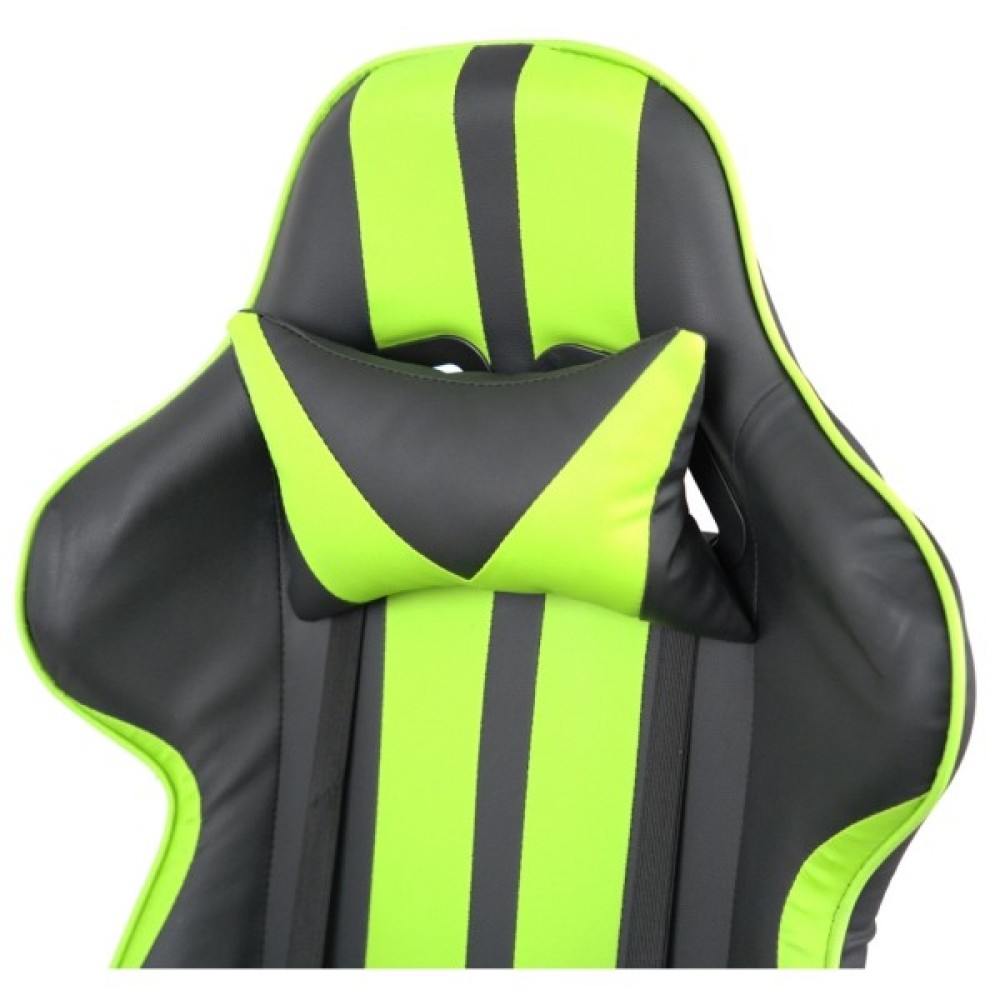 Дизайн крісла вражає своїм спортивним та сучасним виглядом. Поєднання контрастних кольорів – насиченого чорного та яскравого салатового – підкреслює динамічний характер цього аксесуара. Спинка крісла має ергономічну форму з вираженою бічною підтримкою, а додаткові знімні подушки для шиї та попереку сприяють максимальному зручності під час тривалих сесій.