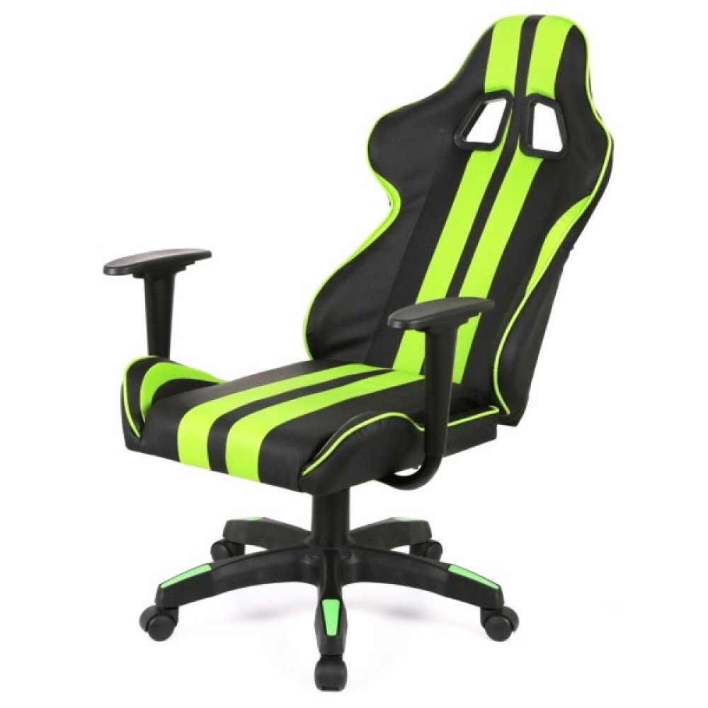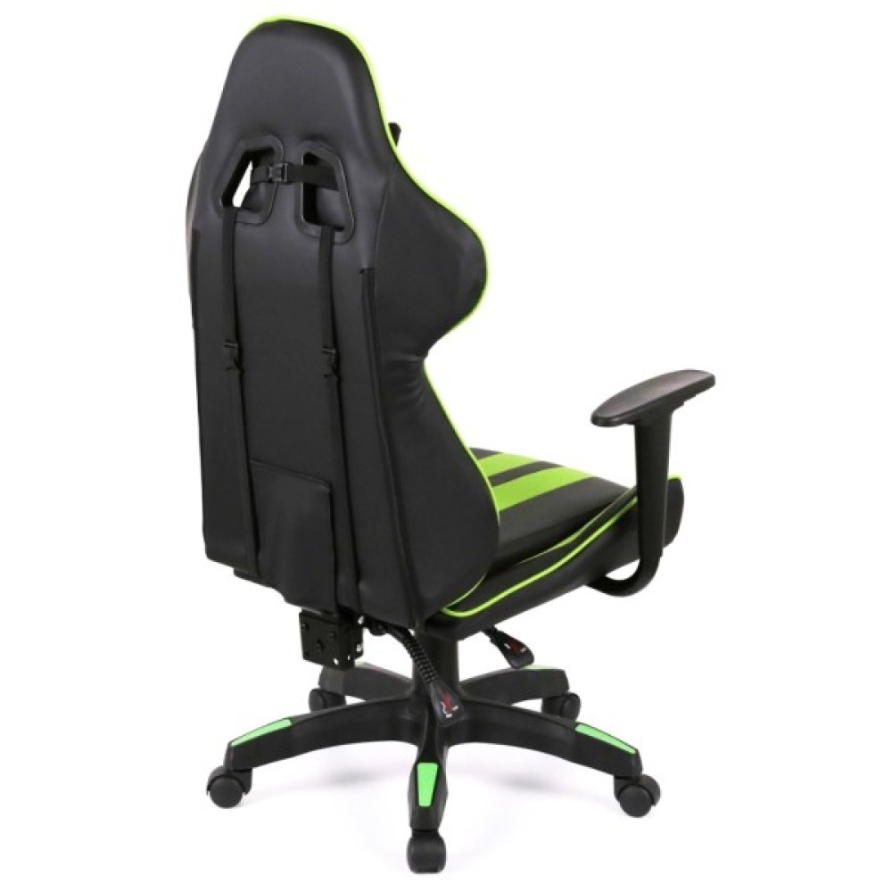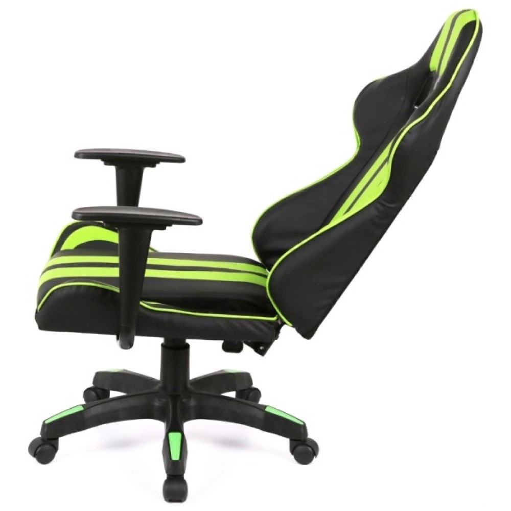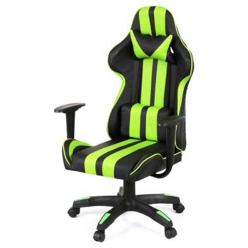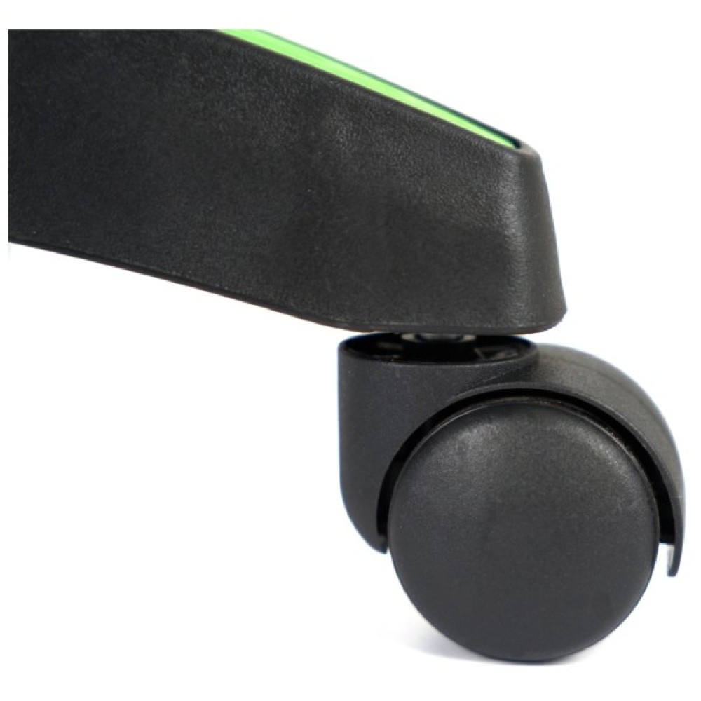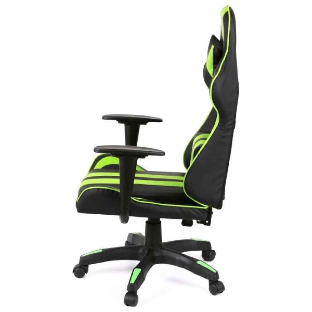 Дизайн крісла вражає своїм спортивним та сучасним виглядом. Поєднання контрастних кольорів – насиченого чорного та яскравого салатового – підкреслює динамічний характер цього аксесуара. Спинка крісла має ергономічну форму з вираженою бічною підтримкою, а додаткові знімні подушки для шиї та попереку сприяють максимальному зручності під час тривалих сесій.