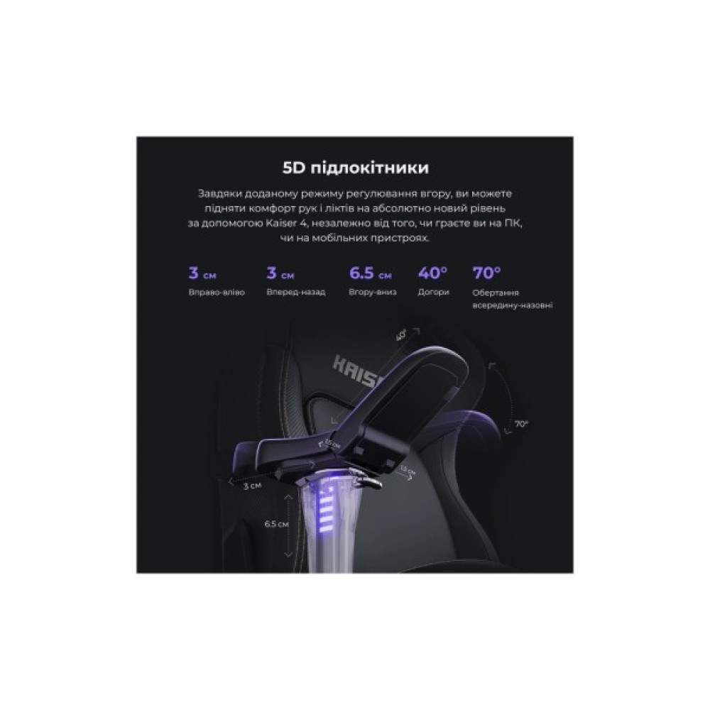 Крісло оснащене 5D підлокітниками, що дозволяють налаштовувати їх під будь-який кут, щоб руки залишалися у зручному положенні і не втомлювалися. Окремої уваги заслуговує магнітна подушка для голови, виготовлена з піни з ефектом пам’яті, яка зберігає прохолоду та комфорт навіть при тривалому використанні.