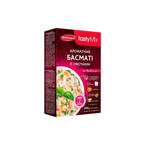 Жменька відібрала 100% натуральні інгредієнти: добірний рис басматі, морква, зелений горошок, кукурудзу, змішали їх у необхідних пропорціях помістили в спеціальні безпечні харчові пакетики для варіння.