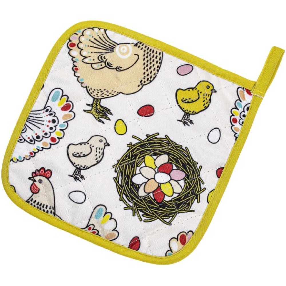 Квадратна прихватка з симпатичним принтом з курочками та жовтою окантовкою. Прихватка оснащена зручною петелькою для підвішування. Виріб виконаний із щільної габардинової тканини, що добре захищає руки при контакті з гарячим посудом. Матеріал міцний, зносостійкий, практичний в експлуатації, тривалий час прослужить, зберігши привабливий зовнішній вигляд.