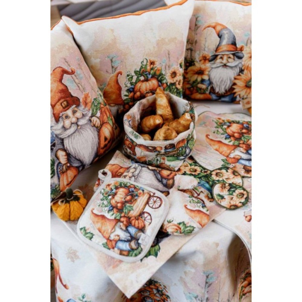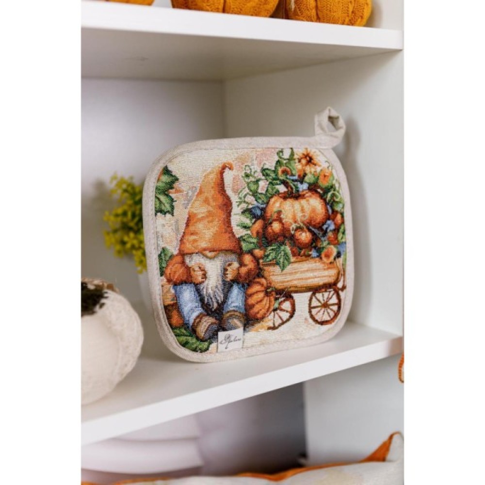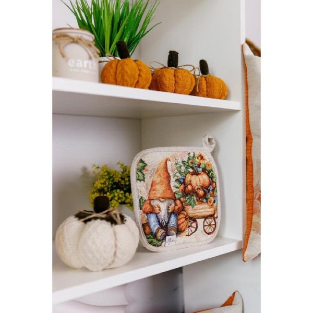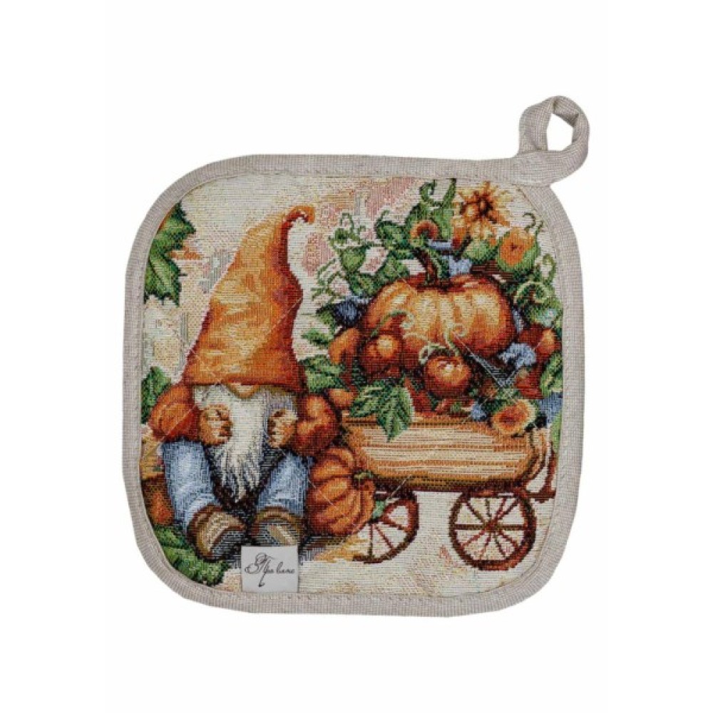 Прихватка з високоякісної іспанської гобеленової тканини. Це стильний подарунок сім'ї, друзям, родичам та коллегам до свят осені та HALLOWEEN. Мальовничий принт прихватки допоможе Вам додати затишку та яскравих фарб до настрою та інтер'єру. Розмір: 20х20см Склад тканини: 40% бавовна, 60%поліестер( гобелен ) Замовити прихватку для гарячого Гарбузові гноми Додатково пропонуємо замовити кошик, фартух, рукавицю, а також скатертину та серветки на стіл з гобеленової колекції Гарбузові гноми.