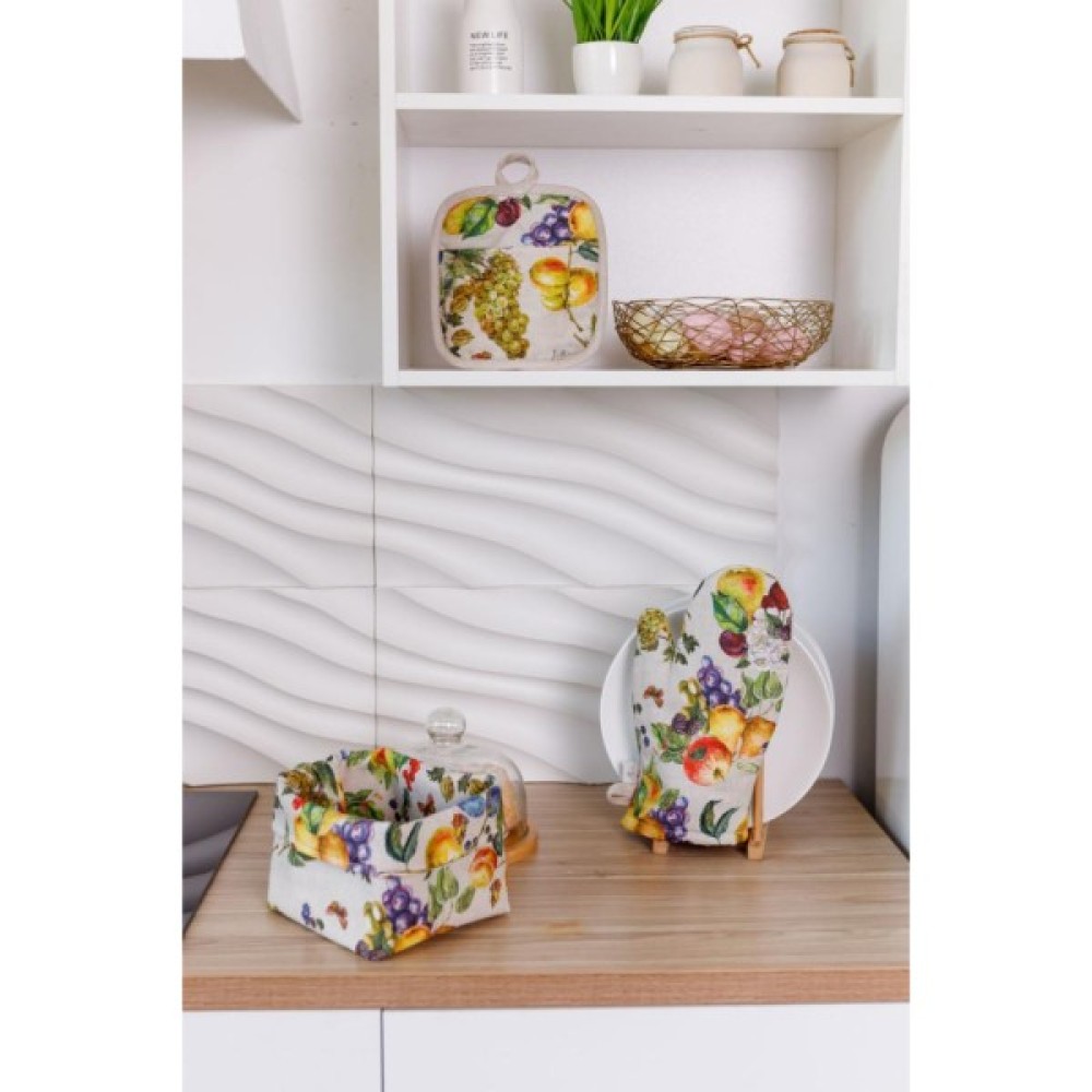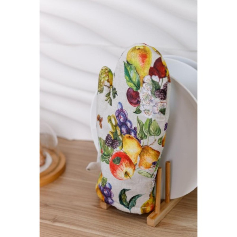 Рукавичка зроблена із натуральної іспанської тканини, насичена кольорова гама. Наповнювач: ватин. Склад тканини: 88% бавовна, 12% поліестер. Розмір: 16х32см. Виробництво: Україна. Замовити прихватки - рукавички для кухні Верона Можна в нашому інтернет-магазині, оформивши замовлення на сайті. До рукавички рекомендуємо замовити прихватку, фартух, кошик для хліба з колекції Верона.