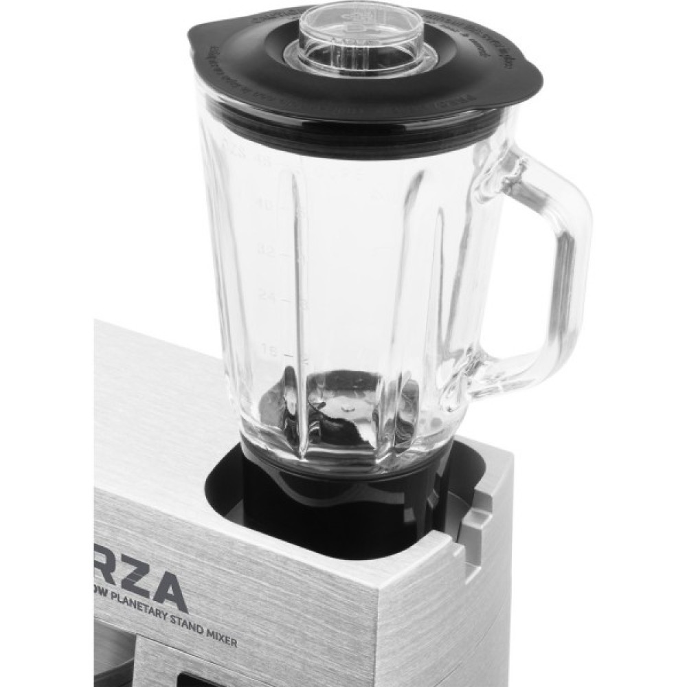 Готувати ідеальний смузі або ніжний соус до основної страви можна, не знімаючи чашу міксера. Скляна склянка блендера об'ємом 1,5 л встановлюється у верхній частині корпусу на окремий привід. Насадка-подрібнювач з 4 гострими сталевими ножами однаково добре порубає лід для коктейлів, приготує пюре або смузі. Кришка унеможливить розбризкування, а носик полегшить процес наливання готової суміші.
