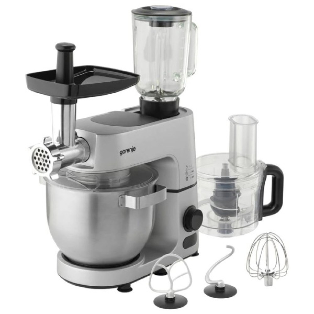 Комплектація: Кухонна машина, гак для замісу тіста, лопатка для змішування, віночок для збивання, 2 диски для нарізки скибочками та шатківниці, 1 ніж, м'ясорубка, 2 диски для фаршу, інструкція, гарантія