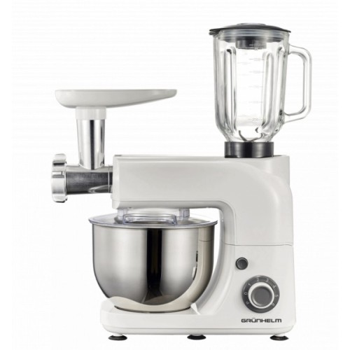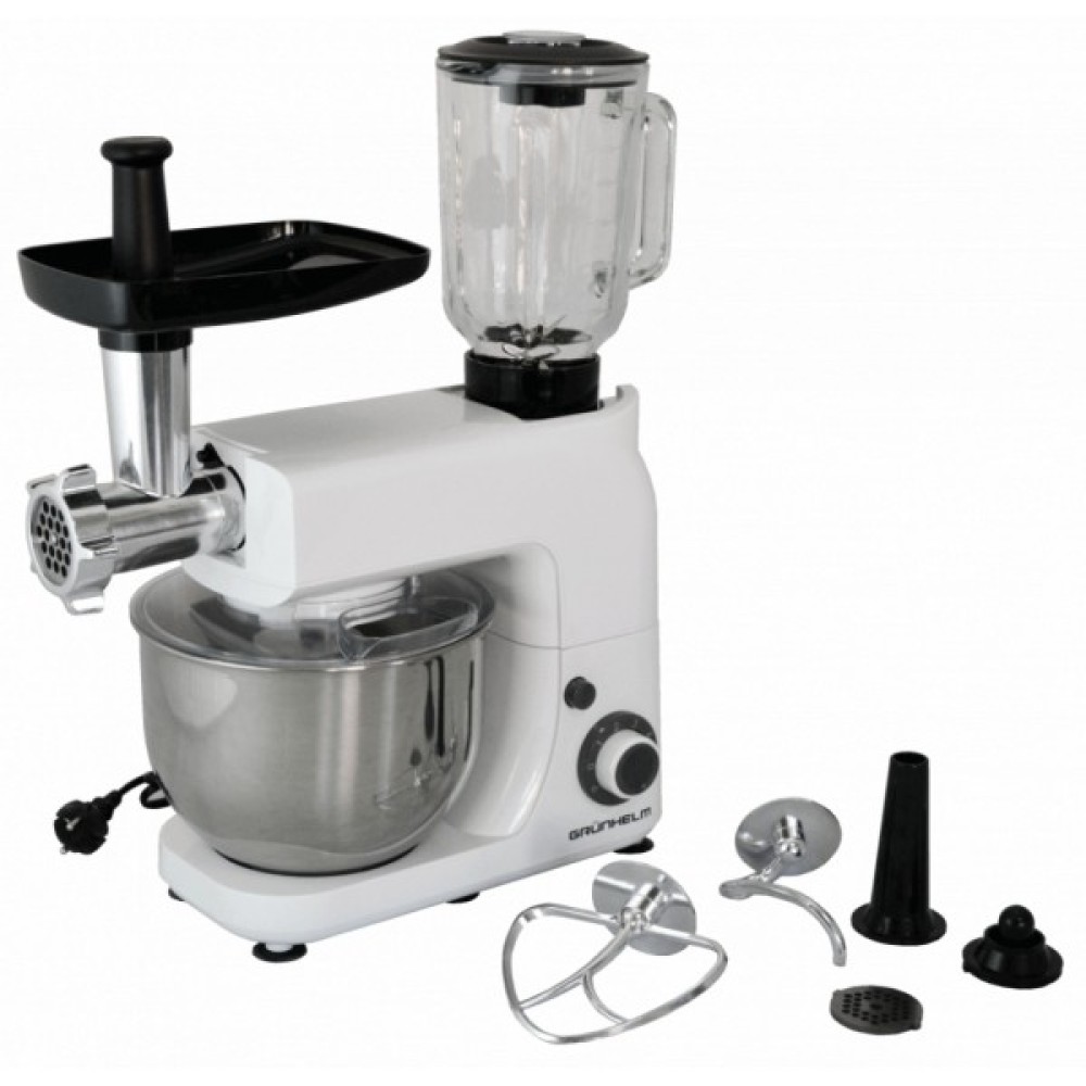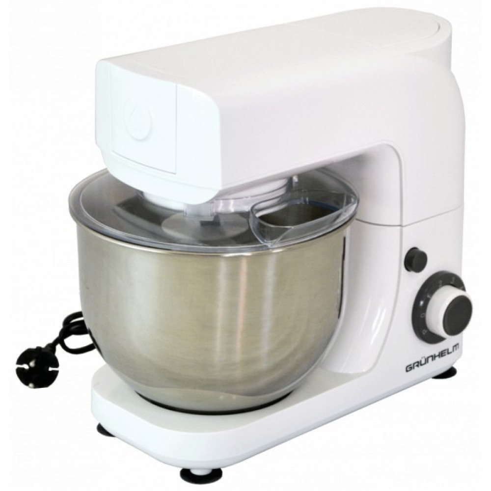 Кухонна машина Grunhelm GKM0020 поєднує в собі якість і стильний дизайн. Вона міцна, універсальна і призначена для простоти використання, а також володіє легкою вагою і зручністю маневрування. У комплект входять 5-літрова чаша з нержавіючої сталі і бризговики, а також віночок, гак для тіста і насадка для збивання. Його потужний мотор потужністю 1800 Вт дозволяє легко готувати суміші, креми та тісто для випічки.