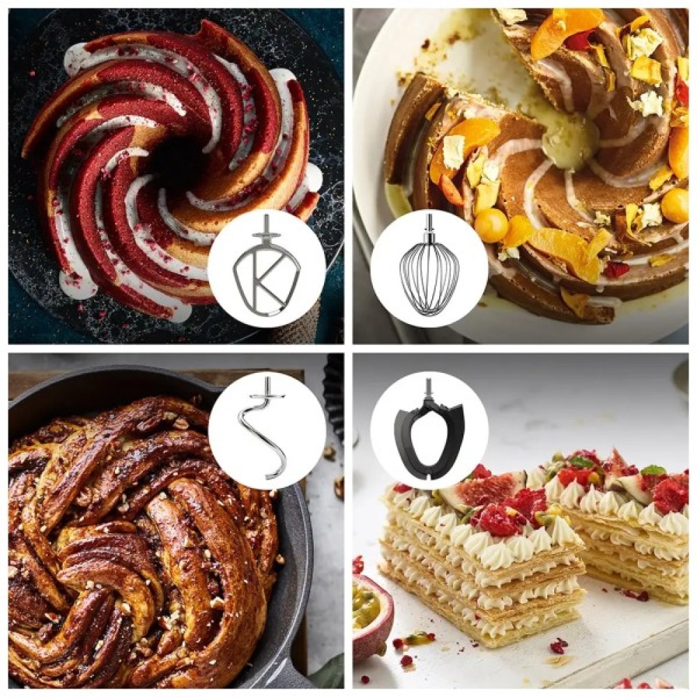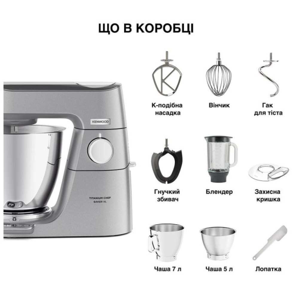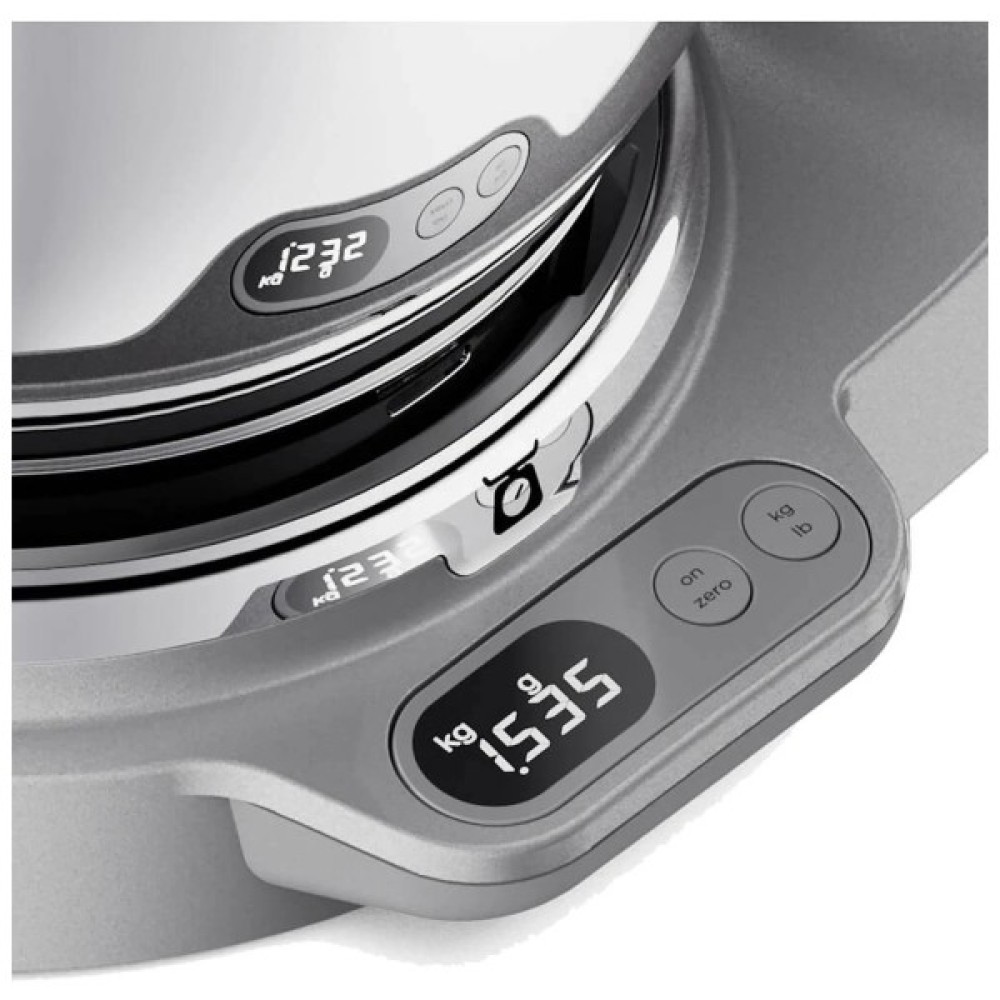 Стандартна комплектація даної кухонної машини включає металевий віночок для збивання, фірмову К-подібну насадку для змішування, гак для замішування густого дріжджового тіста, гнучкий збивач (для кремів), фуд-процесор, скляний блендер, а також прозору захисну кришку від розбризкування, що встановлюється на чашу. До речі, чаш у комплекті тут одразу дві. Основна на 7 та додаткова на 5 літрів. Причому основа кухонної машини навіть оснащена вбудованими електронними вагами, що точно знадобиться для точного дотримання пропорцій інгредієнтів! Кухонна машина може працювати без вашої участі автоматично за таймером (до 30 хвилин). Двигун має 8 швидкостей та режим імпульсного змішування (короткі зупинки, що дозволяють вмісту чаші осідати зі стінок).