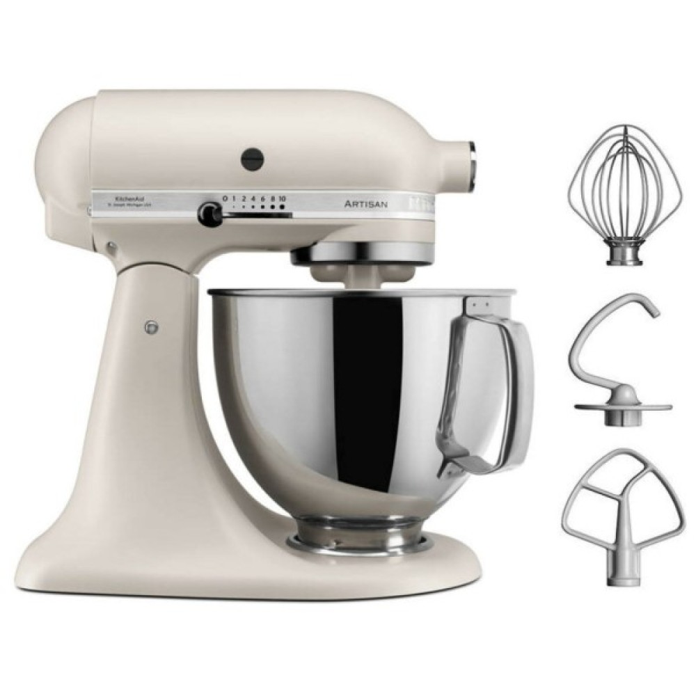 Міксер KitchenAid Artisan 4,8 л 5KSM125EAC - портативний планетарний міксер KITCHEN AID від американського виробника підходить для перемішування, збивання, перетирання та розмелювання різних продуктів. Для приготування майонезу, мусів, суміші для безе використовують дротяний віночок. Лопатка необхідна для замішування тіста для кексів, оладок, печива. Щоб полегшити роботу з крутим тестом для пельменів чи пасти, виробник передбачив насадку-гак.