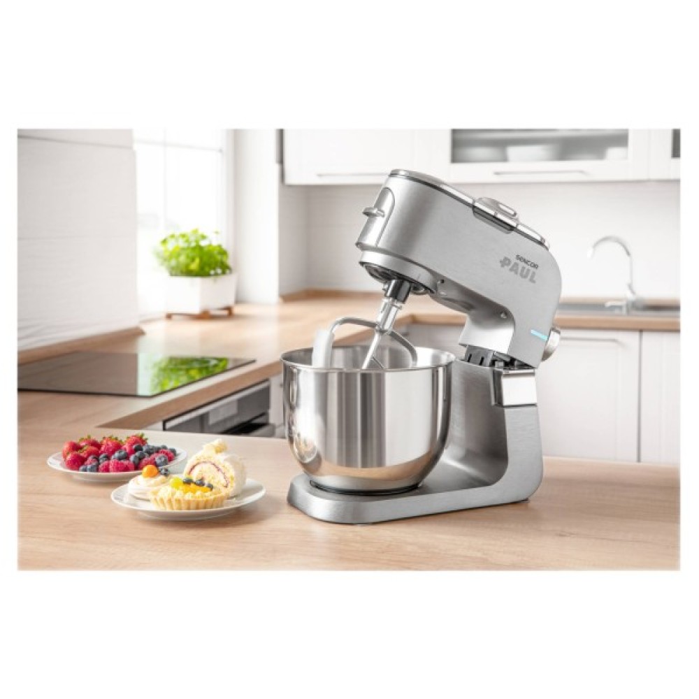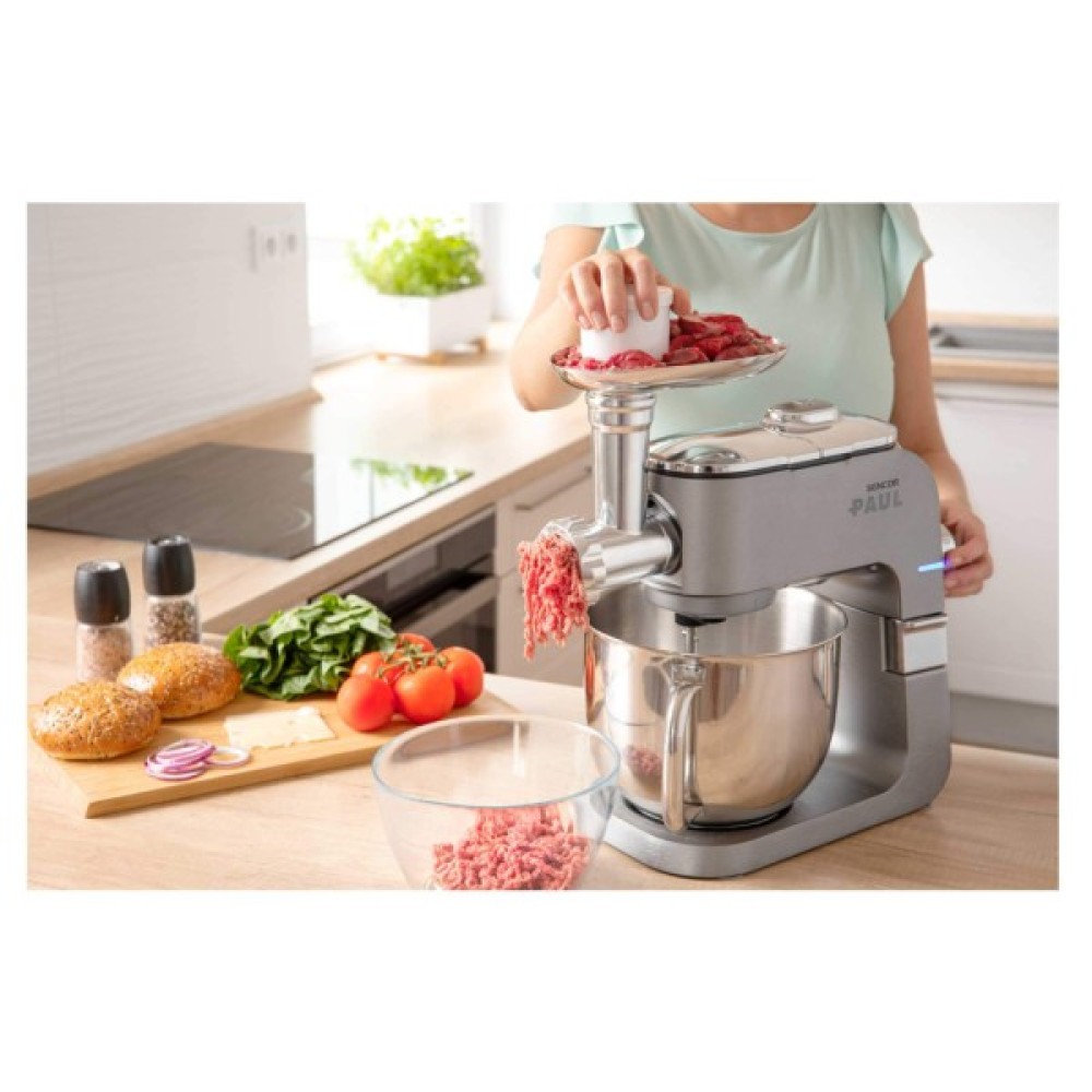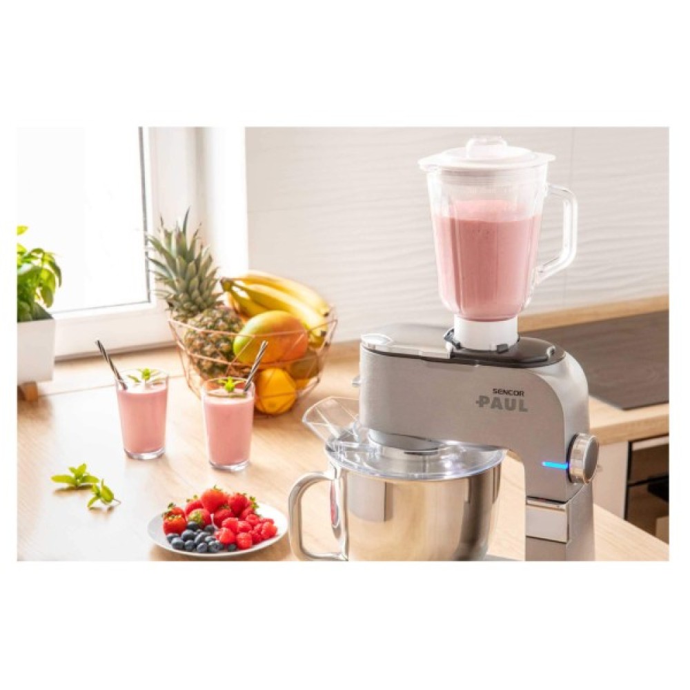 Sencor Paul 1 — кухонна машина з двигуном 1700 Вт і 6-річною гарантією на мотор. Оснащена металевим корпусом із металевими шестернями та конструкцією з трьома приводами. Дві чаші з нержавіючої сталі (6,5 л і 6 л) та 20 насадок розширюють можливості оброблення продуктів. Підтримує функцію імпульсу та систему Sencor Smart Power & Energy для контролю швидкості.