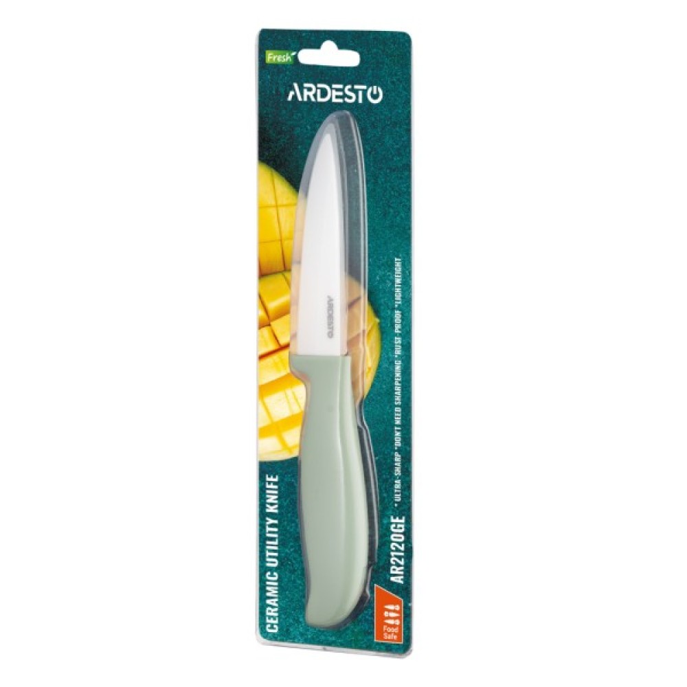Ardesto Fresh - Цей універсальний керамічний ніж буде незамінним помічником на кожній кухні. Виріб виготовлено з якісної кераміки, яка не піддається корозії, не вбирає запахів і не потребує регулярного заточування, зберігаючи гостроту протягом тривалого часу. Призначено для нарізання на дерев’яних і пластикових дошках і заборонено до використання на кам’яних і скляних. Інструментом не можна нарізати кістки, хрящі та заморожені продукти. Загальна довжина виробу 20 см. Оснащено пластиковим зеленим руків’ям, гарантуючи надійний хват і контроль нарізання. Кухонний ніж не призначено для миття в посудомийній машині.