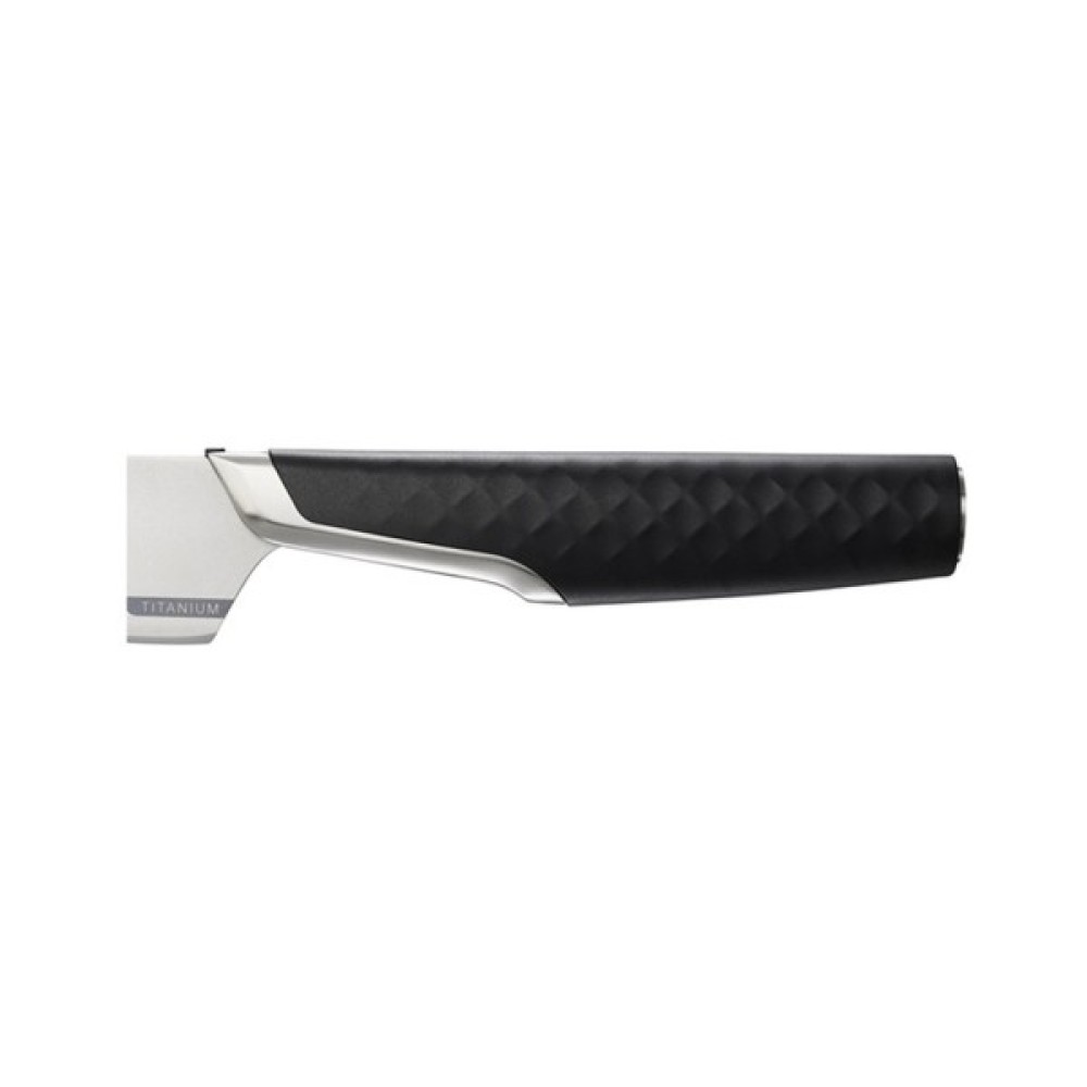 Титан не є магнітним матеріалом, тому ніж не можна зберігати в магнітному тримачі для ножів. Ми рекомендуємо заточувати титановий клинок тільки точильним каменем Fiskars і мити ніж вручну. Ніж не можна використовувати для різання заморожених продуктів або твердих частин, таких як кістки.