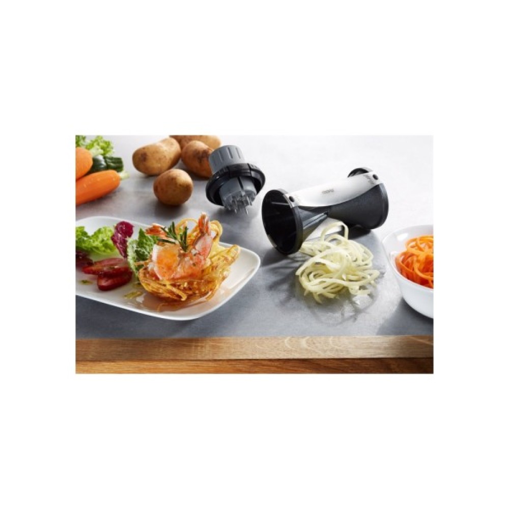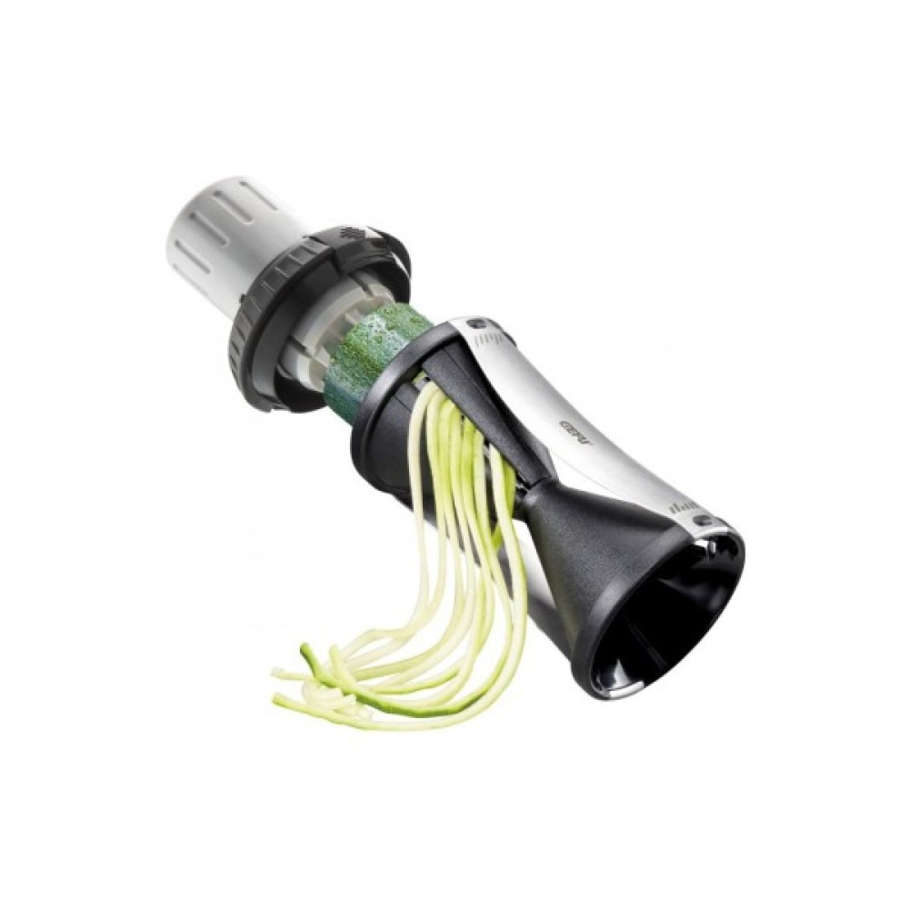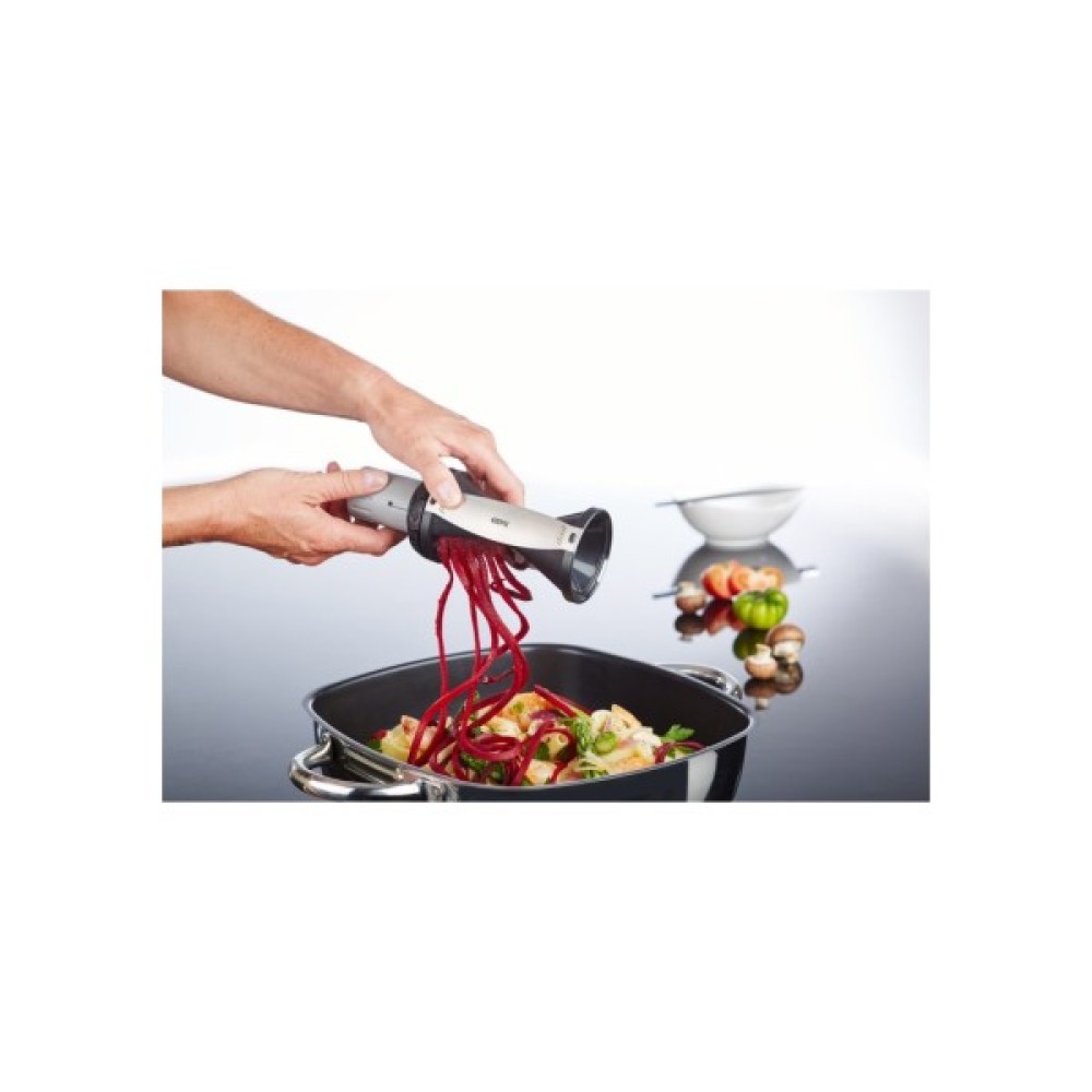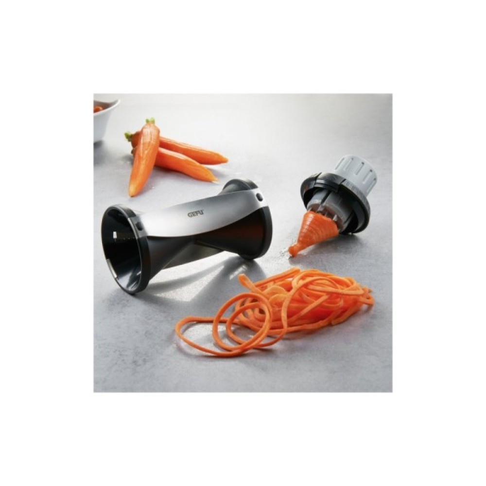 Спіральний ніж Gefu Spirelli 2.0 — практичне й інноваційне кухонне пристосування, яке потішить будь-яку господиню. За допомогою гострих ножів овочі перетворюються на тонку довгу спіраль, яку дуже легко готувати та приємно їсти. Цукіні, огірок, морква, кабачок й інші овочі набувають неповторного вигляду серпантину, який здивує будь-якого гурмана. Тримач допоможе нарізати овочі з мінімальним залишком, а також захистить Ваші пальці від пошкодження об леза Spirelli.