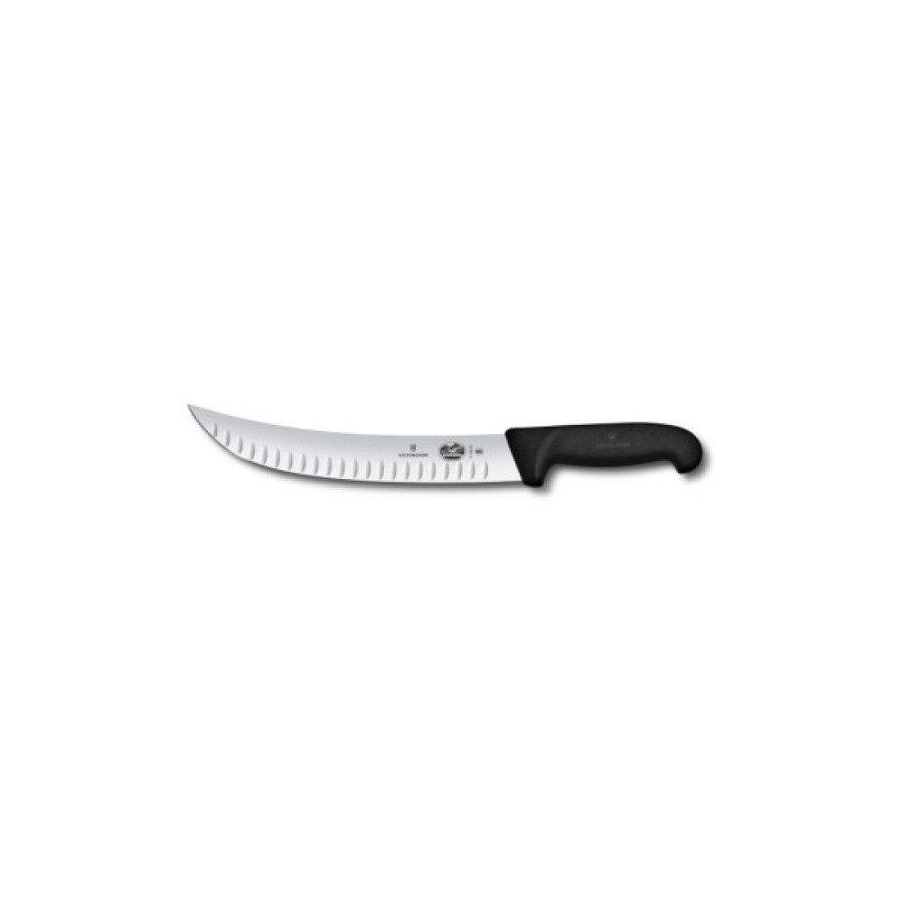 FIBROX Butcher - м'ясницький ніж із рифленим вигнутим лезом. Ультрагострий інструмент від швейцарської компанії Victorinox. Довжина леза 20 см. Рифлена бічна поверхня. Гладка заточування ріжучої кромки. Дизайн із чорною рукояттю. Професійний ніж із супергострим лезом, який підійде як для аматорів, так і для працівників великих заготівельних підприємств. Неймовірно гострий та довговічний помічник.