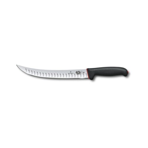 М'ясницький ніж Фіброкс Дуал Грип 5.7223.25D оснащений гострим штампованим клинком вигнутої форми. За оптимізацію робочого процесу відповідає рифлена бічна поверхня, яка завдяки своєрідним повітряним кишеням мінімізує прилипання продукту до леза. Ніж доповнений гравіюванням із назвою, логотипом, фірмовою емблемою, маркуванням NSF та номером моделі, що гарантує справжність інструменту. Ножі Фіброкс можуть стерилізуватися та митися у посудомийці.