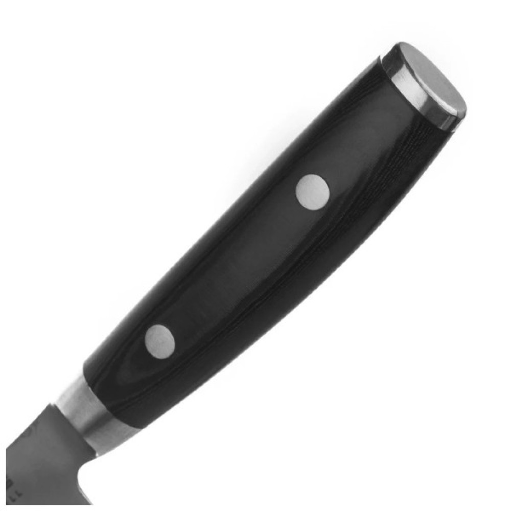 Ідеально відполірована чорна рукоятка кухонного ножа Yaxell RAN виготовлена з матеріалу канва микарта – це льон, просочений смолою. Це витривалий довговічний матеріал, який витримує інтенсивні навантаження, не вбирає запахи. Рукоятка надійно закріплена, на кінці має металеве навершя для кращого балансування ножа.