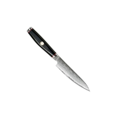 Японский нож для чистки овощей и фруктов серии Super GOU Ypsilon с лезвием из дамасской стали 12 см подходит для ежедневного использования на профессиональной или домашней кухне, поскольку выдерживает любую рабочую нагрузку. В основе клинка высококачественная японская порошковя сталь SG2, покрытая защитными обкладками из 190 слоев нержавеющей стали с эффектным дамасским узором на лезвии.