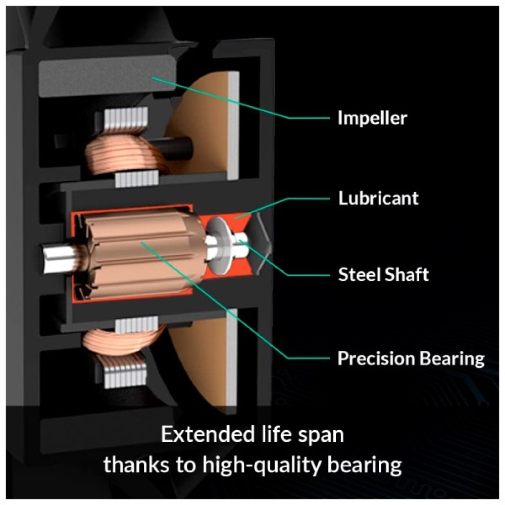 Максимальна тиша, мінімальна вібрація Навіть на низьких швидкостях робочий звук нового двигуна ARCTIC ледь помітний. Завдяки синусоїдальному намагнічуванню новий двигун створює всього приблизно 5% вібрації від комутації звичайного двигуна постійного струму без фільтра.