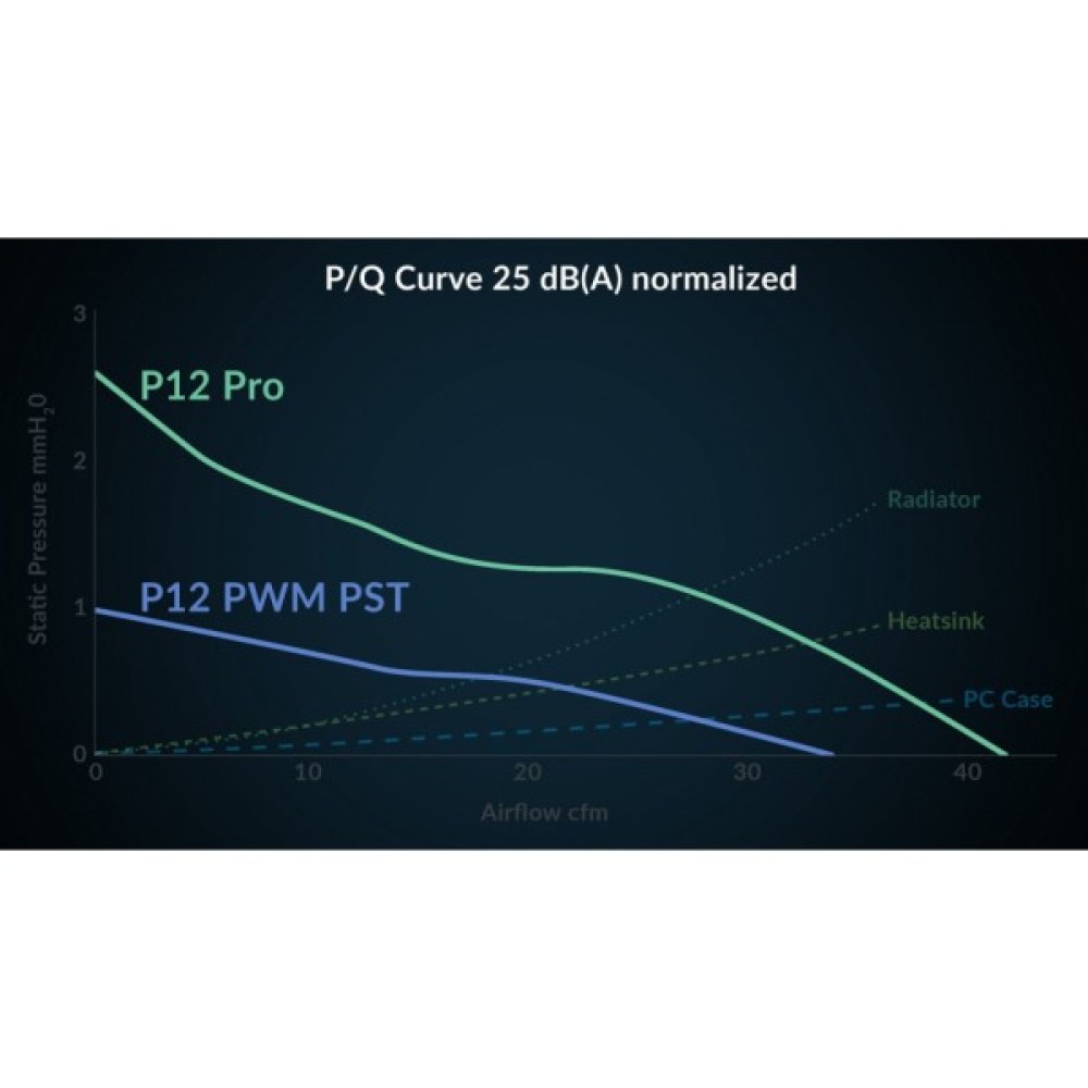 - Більше потужності - менше шуму. Вентилятор забезпечує більшу продуктивність на низьких швидкостях з більшим повітряним потоком і статичним тиском лише на рівні 25 дБ(А) - ідеально підходить для тихого та потужного охолодження