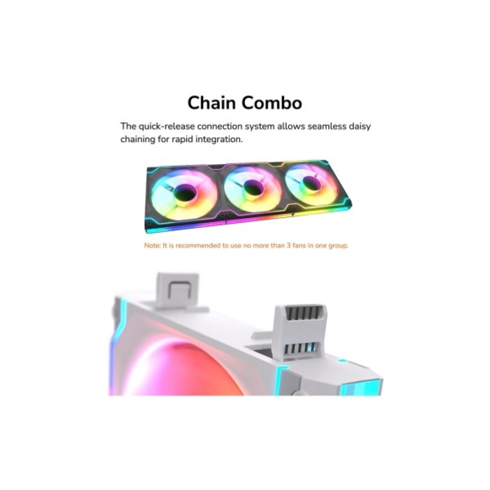 Система швидкороз'ємних з'єднань дозволяє здійснювати безшовне послідовне підключення для швидкої інтеграції, гарантуючи оптимальну ефективність повітряного потоку: швидка проста збірка без інструментів, яка дозволяє підтримувати охолодження вашої системи без зайвого клопоту. (Рекомендована конфігурація через ваші обмеження з джерелами живлення - не більше 3 вентиляторів)