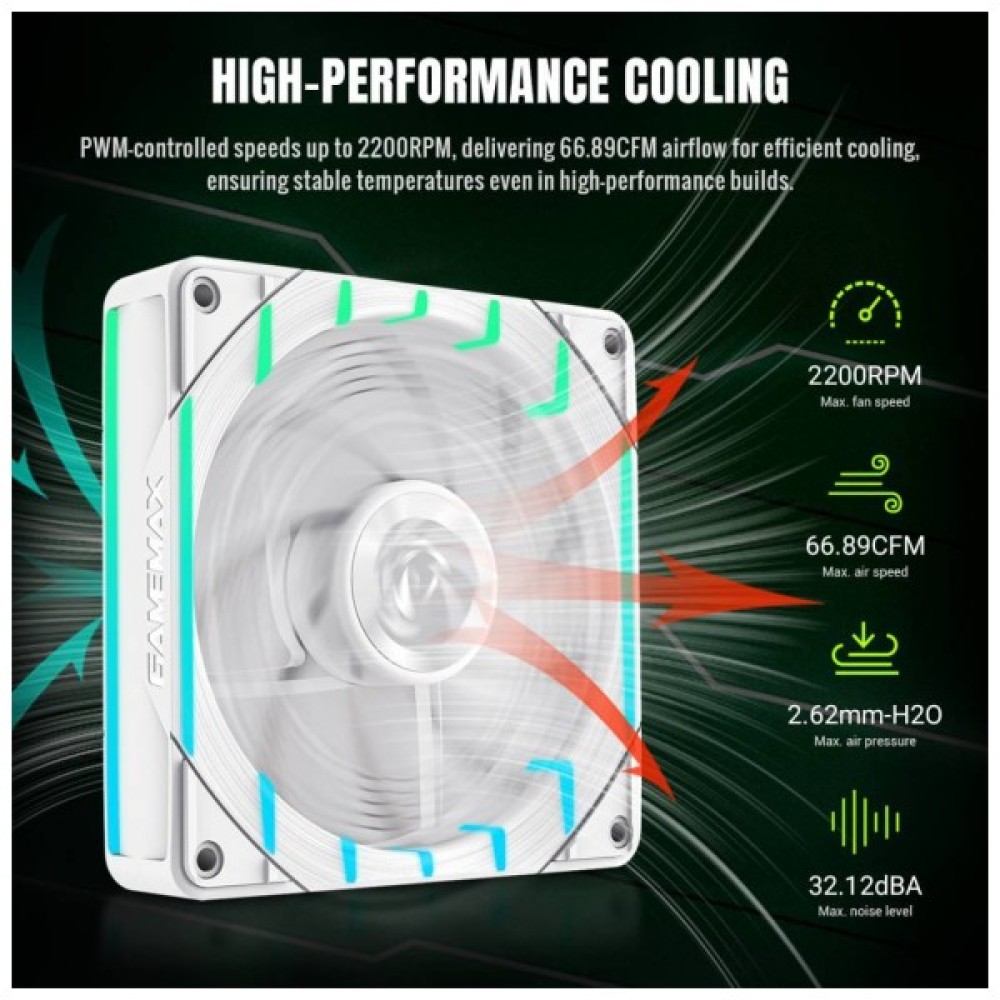 Приголомшливе ARGB-підсвічування: 24 ARGB-світлодіоди створюють унікальний ефект сліду кігтя GameMax. Підтримує синхронізоване регулювання підсвічування з материнською платою, додаючи естетики кіберспорту до вашого корпусу ПК.