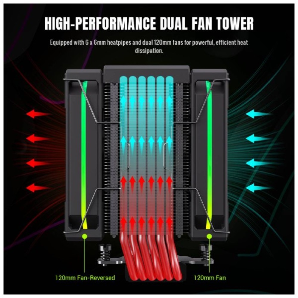 6 теплових трубок діаметром 6 мм та два 120-мм вентилятори забезпечують швидке й рівномірне відведення тепла.