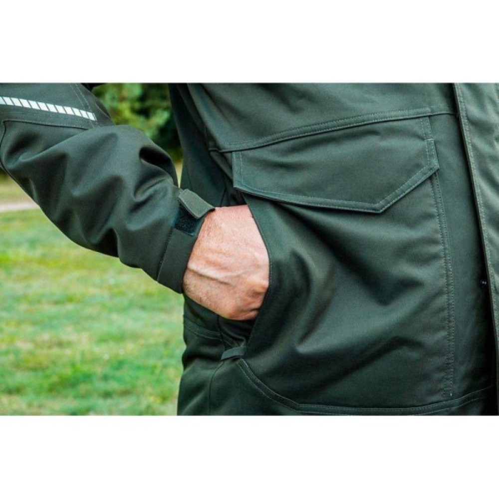 Куртка з мембраною TPU дозволяє зберігати тепловий комфорт під час дощу. Відмінно захищає у холоди та морози. Куртка оснащена зручним капюшоном з регулюванням, прихованим у комірі-стійкі, регулюванням на липучці манжет рукава для оптимального підгонки та можливістю регулювання обхвату талії. Має внутрішню кишеню, нагрудну кишеню та подвійні кишені: верхня застібається на кнопку, нижня на блискавку. Світловідбивні елементи куртки забезпечують хорошу видимість та безпеку у будь-який час доби та за різних погодних умов. Продукт сертифікований CE на відповідність стандарту EN ISO 13688:2013.