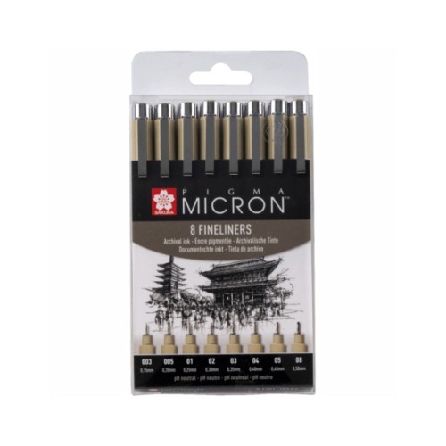 Лінери PIGMA Micron від Sakura - професійні лінери із мікропігментними чорнилами. Водостійкі пігментні архівні чорнила на водній основі. Стійкі до вицвітання, та розтирання. Не протікають навіть через дуже тонкий папір, не висихають, при відкритому ковпачку (навіть на протязі декількох днів).Лінери PIGMA Micron від Sakura чудово підходять для скетчів, ілюстрацій, креслень, письма, ведення щоденників, архівів, довідників і т.д. З лінерами PIGMA Micron ви легко зможете зробити ідеально чіткі лінії однакової товщини, практично під будь-яким кутом нахилу.В наборі 8 лінерів, чорного кольору:- 003 (0.15мм)- 005 (0.2мм)- 01 (0.25мм)- 02 (0.3мм)- 03 (0.35мм)- 04 (0.4мм)- 05 (0.45мм)- 08 (0.5мм)Виробник: Sakura, Японія