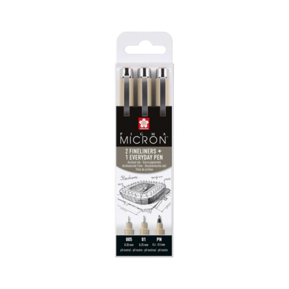 Лінери PIGMA Micron від Sakura - професійні лінери із мікропігментними чорнилами. Водостійкі пігментні архівні чорнила на водній основі. Стійкі до вицвітання, та розтирання. Не протікають навіть через дуже тонкий папір, не висихають, при відкритому ковпачку (навіть на протязі декількох днів).Лінери PIGMA Micron від Sakura чудово підходять для скетчів, ілюстрацій, креслень, письма, ведення щоденників, архівів, довідників і т.д. З лінерами PIGMA Micron ви легко зможете зробити ідеально чіткі лінії однакової товщини, практично під будь-яким кутом нахилу.В наборі 2 лінера та ручка PIGMA Micron PN чорного коьору:- 005 (0.мм)- 01 (0.25мм)- ручка PIGMA Micron PNВиробник: Sakura, Японія