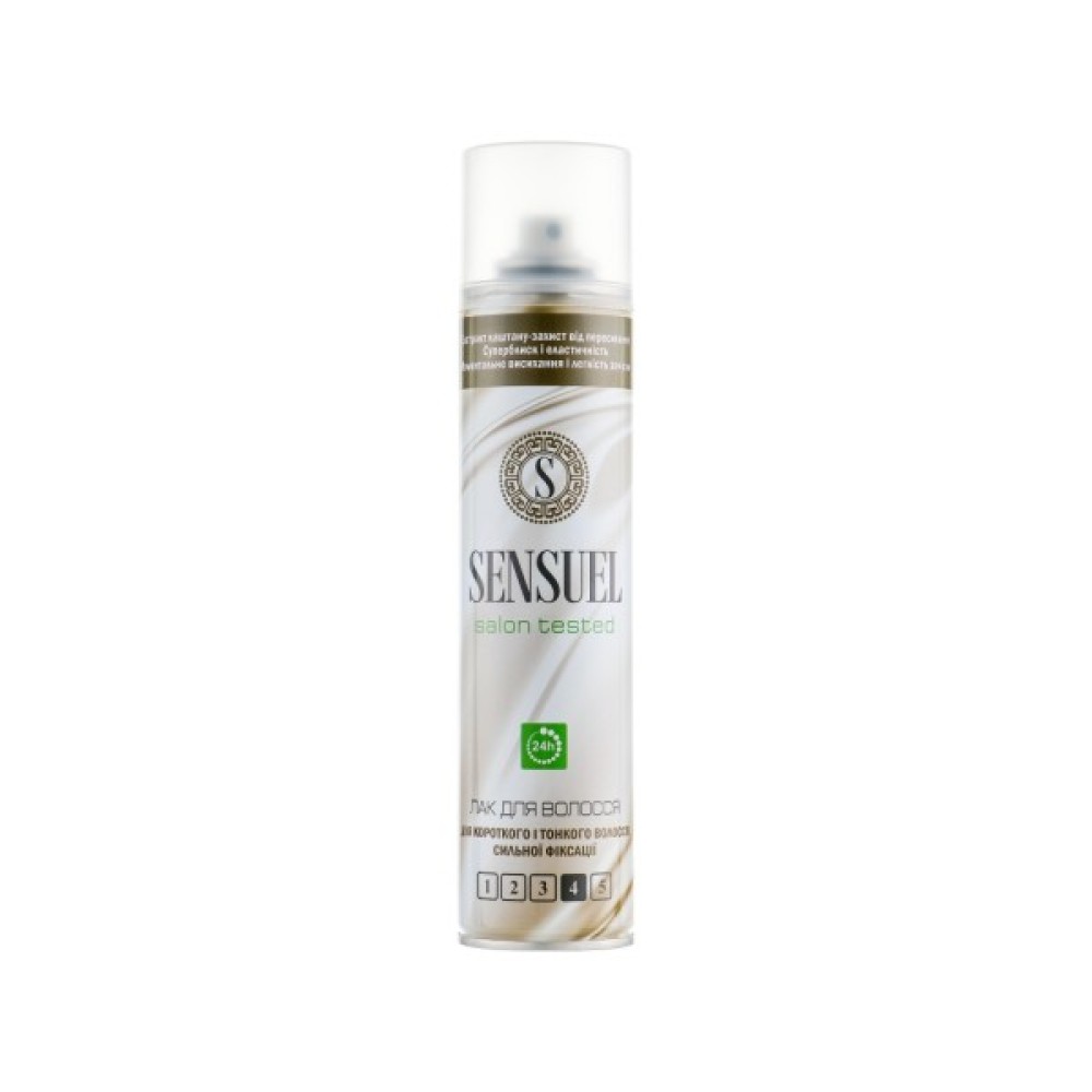Засіб забезпечує сильну фіксацію і не залишає відчуття липкості. Ваші локони будуть пружними і сяючими без ефекту склеювання! Зачіска збереже бездоганний вигляд протягом 24 годин. До складу лаку Sensuel входить доглядовий інгредієнт — екстракт каштана, завдяки чому волосся захищене від пересушування і шкідливого сонячного випромінювання.