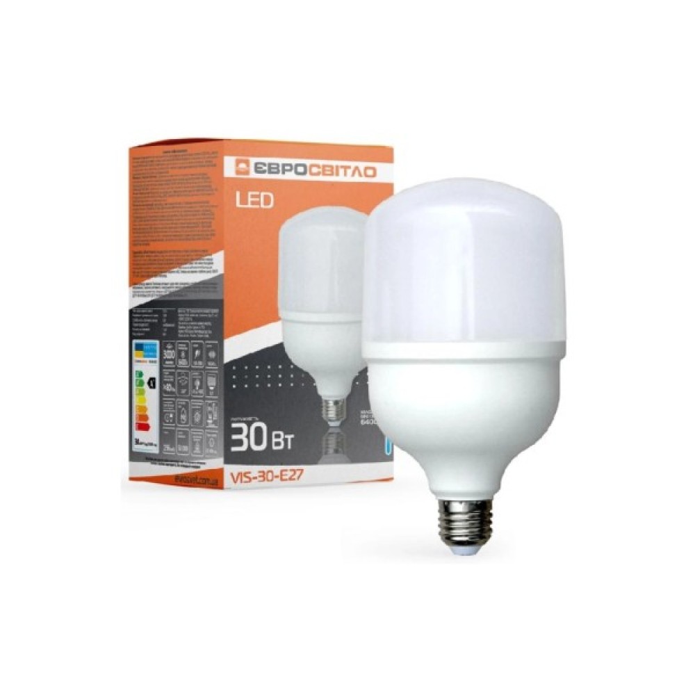 Лампа світлодіодна високопотужна Євросвітло 30Вт 6400К (VIS-30-E27) підходить для місць, де важливо яскраве освітлення, що не спотворює колір.