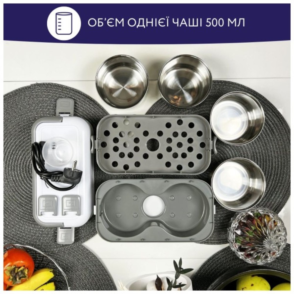 Ланч-бокс виготовлений із харчового матеріалу, внутрішня місткість виготовлена з неіржавкої сталі 304. Високоякісний термостійкий, міцний матеріал, який є абсолютно нетоксичним. Має водонепроникну конструкцію. Обов'язково додайте воду всередину, оскільки завдяки функції перегріву ланч-бокс автоматично вимкнеться, коли вода закінчиться. Дві чаші з неіржавкої сталі знімні, зручно чистити. Невидимий дизайн ручки. Його легко підіймати, зручно переносити, ланч-бокс ідеально підходить для людей, які ходять на роботу або до школи, ви можете підігрівати їжу в школі, офісі чи подорожі.
