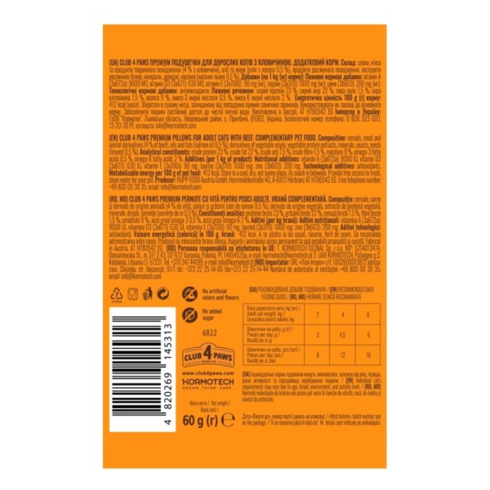 Ласощі, котів, Club, 4, Paws, Подушечки, з, яловичиною, 60, г, 4820269145313