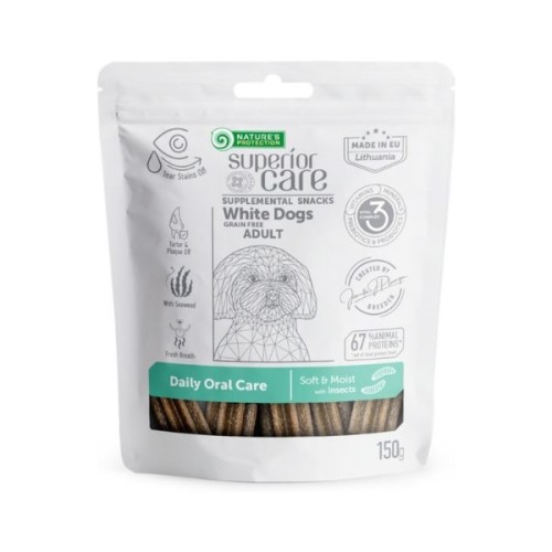 Беззернові ласощі Nature's Protection Superior Care White Dogs Grain Free Daily Oral Care – це високоякісна добавка до корму, призначенадля дорослих собак усіх порід. Це чудовий вибір, щоб показати любов до вашого улюбленця й водночас забезпечити його щоденною нормою необхідних вітамінів, мінералів, пребіотиків та пробіотиків.