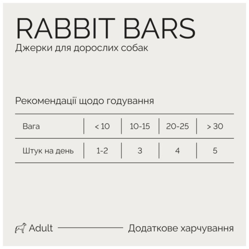 Джерки для дорослих собак Батончики з кроликом містять 87% справжнього м’яса кролика, індички та курки, не містить ГМО, не містить зернових.