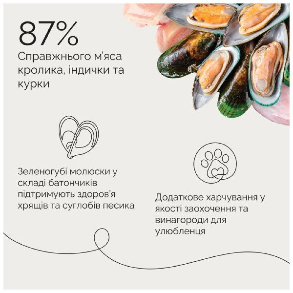 Склад: м'ясо та продукти тваринного походження індичка 37 %, кролик 26 %, курка 24 %, гліцерин рослинного походження, лігноцелюлоза, хлорид натрію, зеленогубі молюски 100 мг/кг.