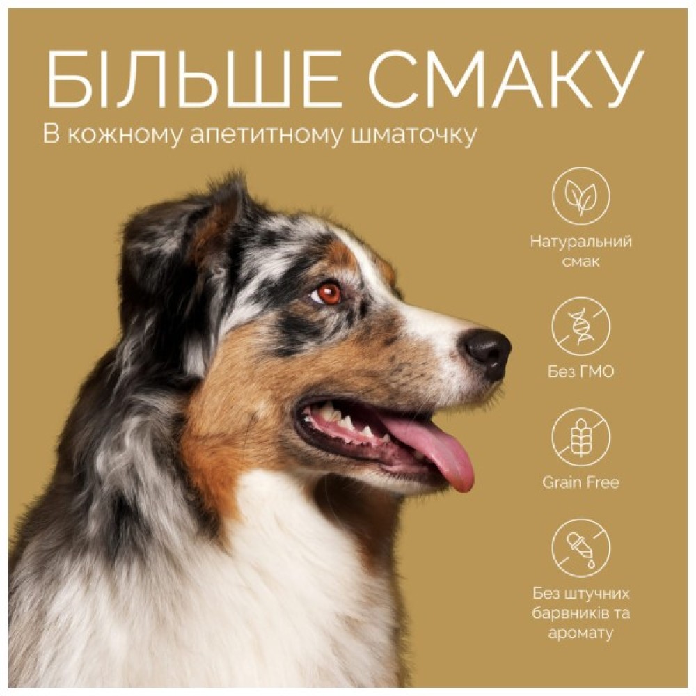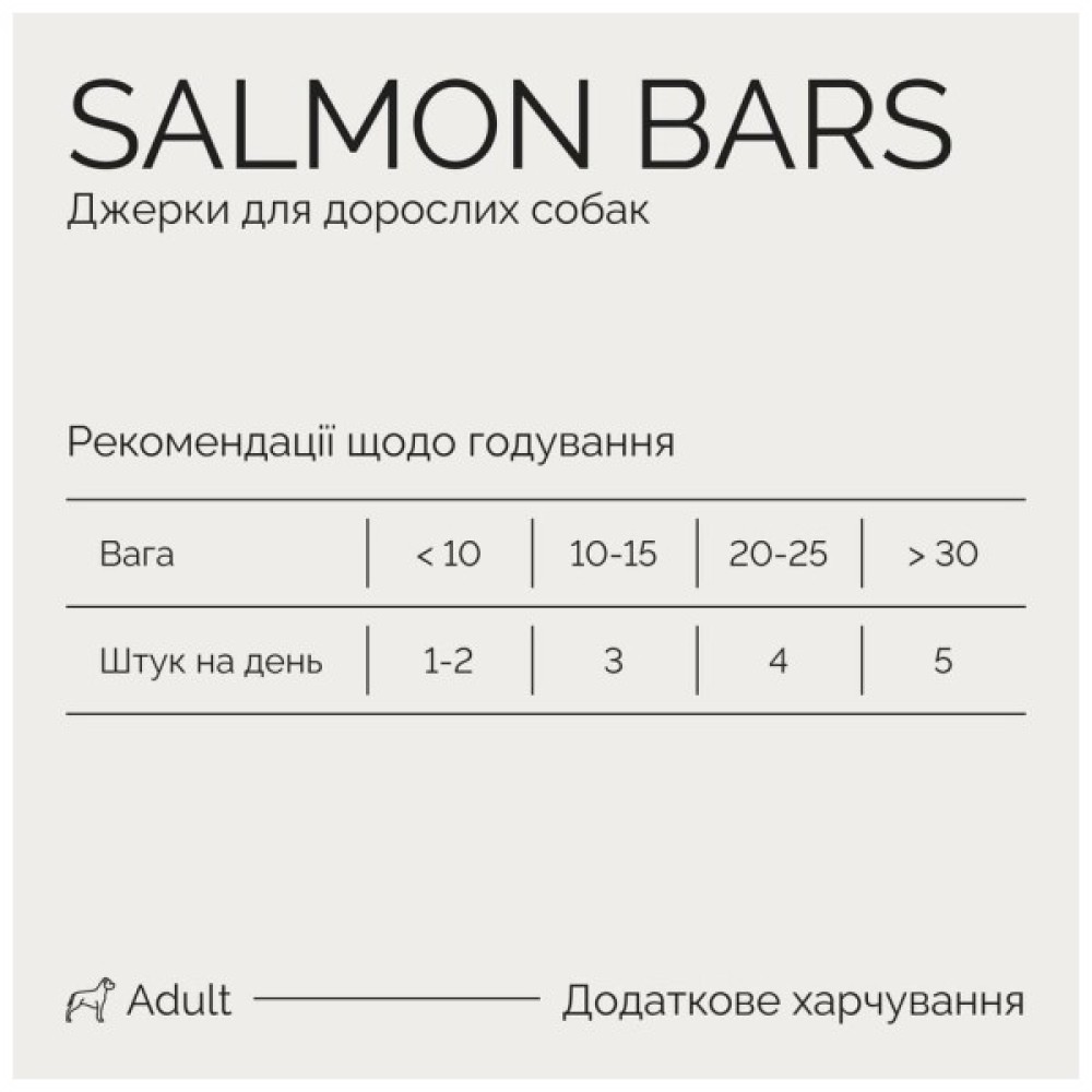 Джерки для дорослих собак Батончики з лососем містять 87% справжнього лосося, м’яса індички та курки, не містить ГМО, не містить зернових.