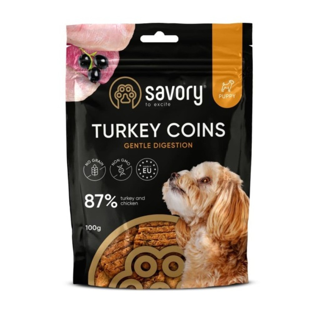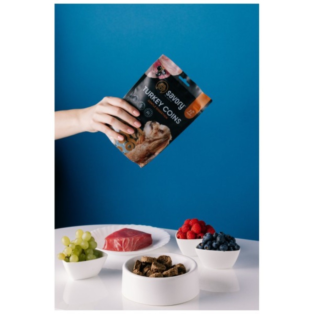 Лінійка ласощів Джерки від Savory – це нове поєднання улюблених смаків, високий вміст м’яса та щільні великі шматочки які можна смакувати ще довше. Монетки не містять зернових та інших додаткових вуглеводів, що робить їх абсолютно безпечними для улюбленців які мають чутливість до глютену. Додавання добірних ягід робить ці смаколики Savory не лише приємним але й корисним перекусом.