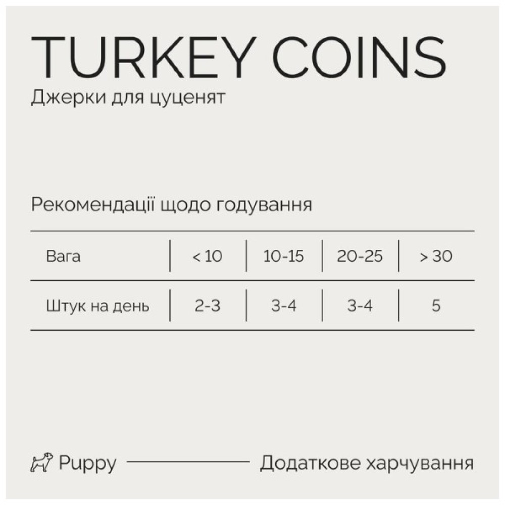 Джерки для цуценят у формі монеток з індичкою містять 87% справжнього м’яса індички та курки, не містить ГМО, не містить зернових.