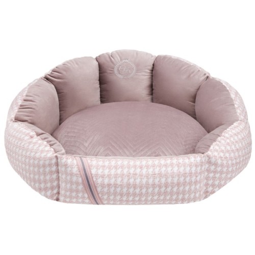 Щоб урізноманітнити дизайн, подушка оздоблена стьобаним матеріалом, а ззовні – перфорований плед із принтом «гусячі лапки», що створює ефект 3D. Спереду лежанка декорована елегантною стрічкою з додаванням шовку.