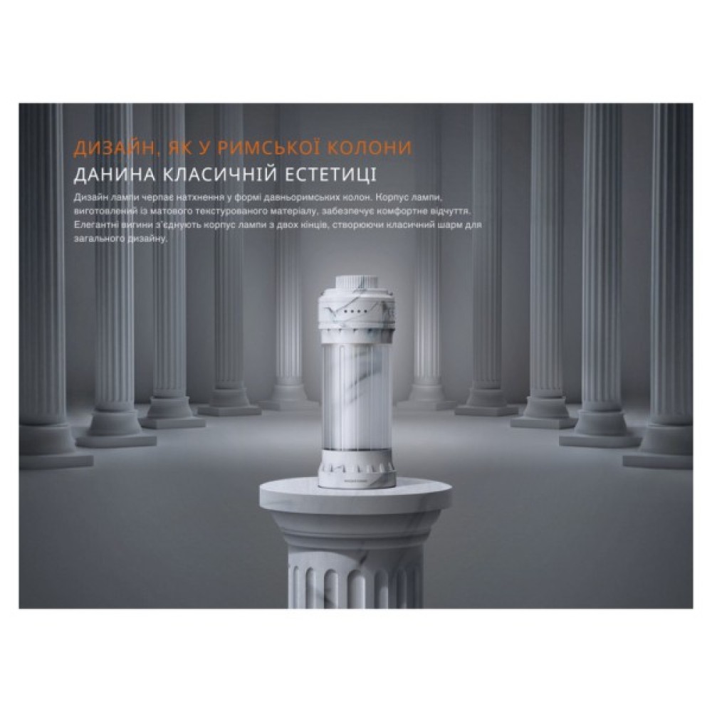 Габарити складають 115 мм у довжину, при вазі всього 135 г, що робить ліхтар легким для транспортування. Ви можете встановити його на рівну поверхню або підвісити за зручний карабін для ще більшої мобільності. Його естетика також не залишиться непоміченою: ліхтар може стати стильним елементом декору завдяки елегантному дизайну, що нагадує римську колону.