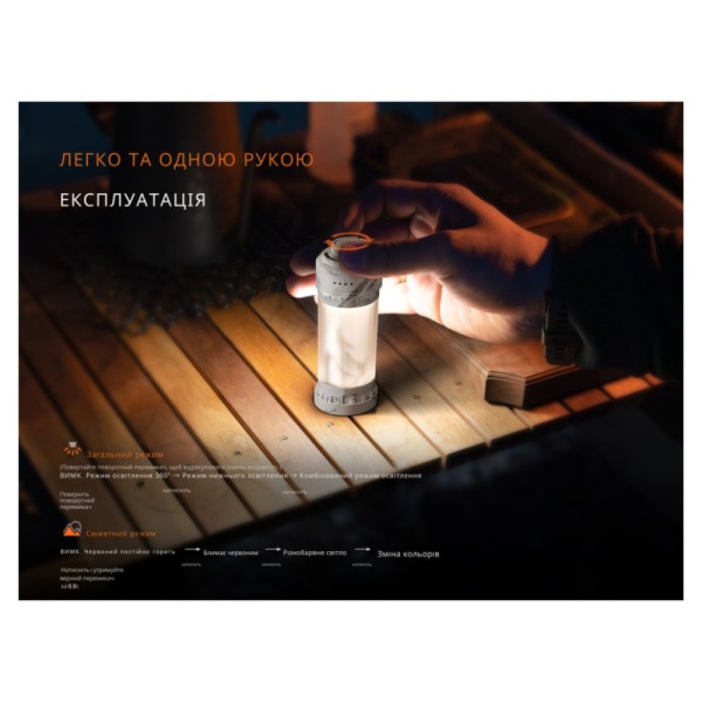 Ліхтар Fenix CL22R чорний (CL22RBK) – це ідеальне рішення для любителів активного відпочинку, туристів й усіх, хто цінує якість і зручність у використанні освітлювальних приладів. Створений з увагою до деталей, цей кемпінговий ліхтар поєднує в собі передові технології та міцний, стильний дизайн, що пасує як для природи, так і для домашнього інтер'єру.
