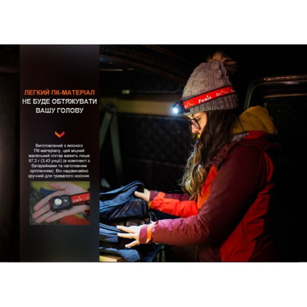Ліхтар комплектується регульованим перфорованим оголов'ям зі світловідбиваючими елементами, що підвищує видимість і безпеку користувача у темряві. Вся конструкція має 64 х 48 х 27 мм розмірів, що робить Fenix HL16 компактним і простим у зберіганні.