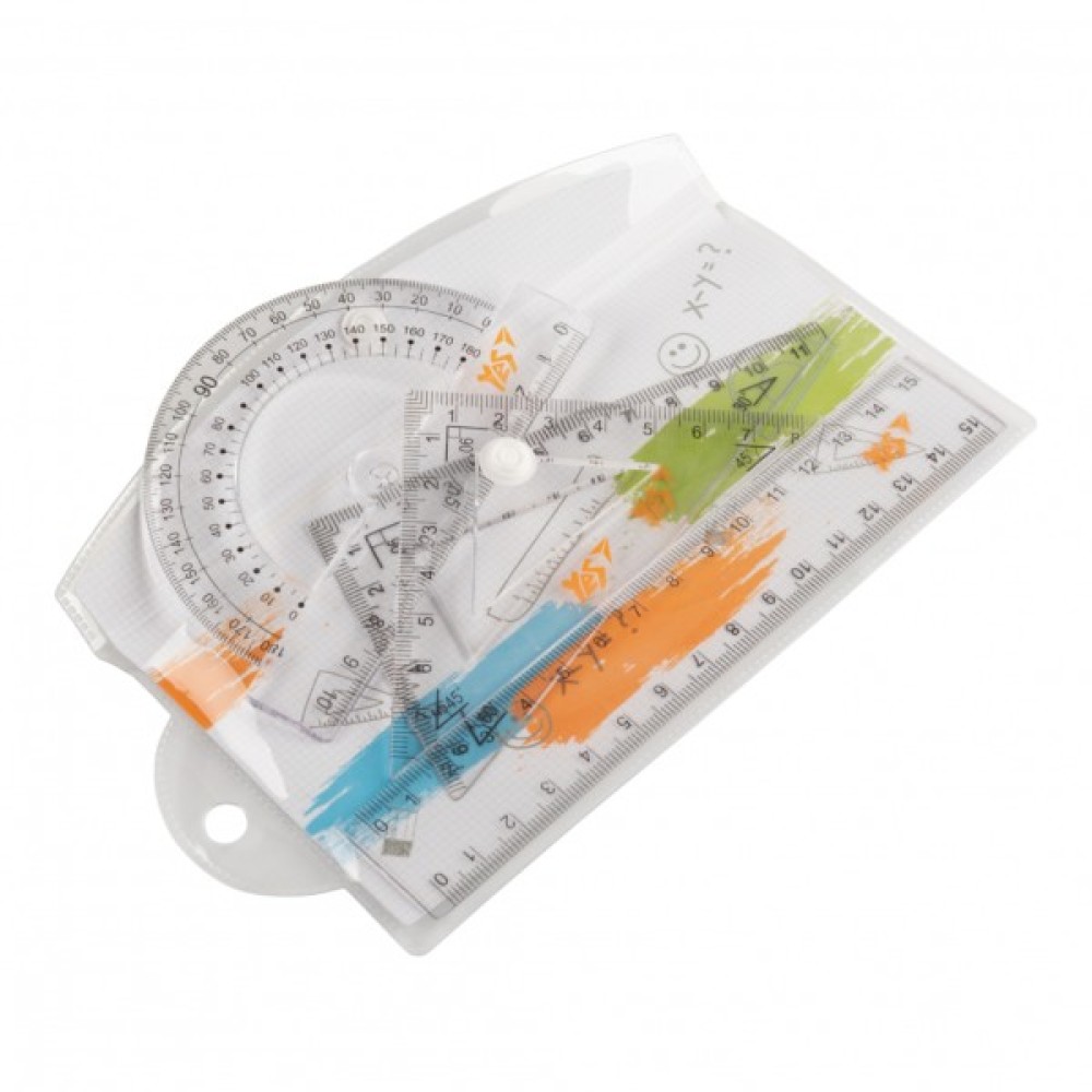- склад набору: лінійка 15 см, транспортир 180 °, трикутник рівнобедрений 8х8 см, трикутник прямокутний 11х6 см.