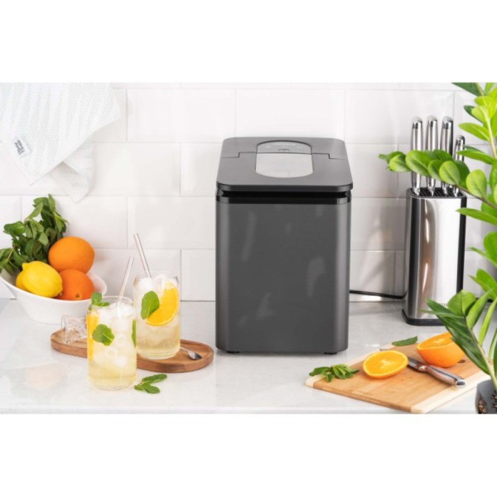 Корпус льодогенератора виконано з міцного полікарбонату.                                                                                                                                                                                                                                              На кришці розташоване прозоре віконце, сенсорна панель управління з індикаторами живлення, відсутності води та повного заповнення кошика. У комплекті поставки є спеціальна лопатка, а швидкий злив води реалізовано за допомогою клапана в нижній частині пристрою.