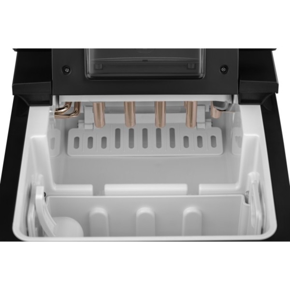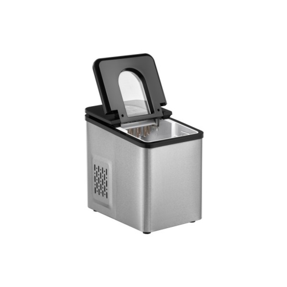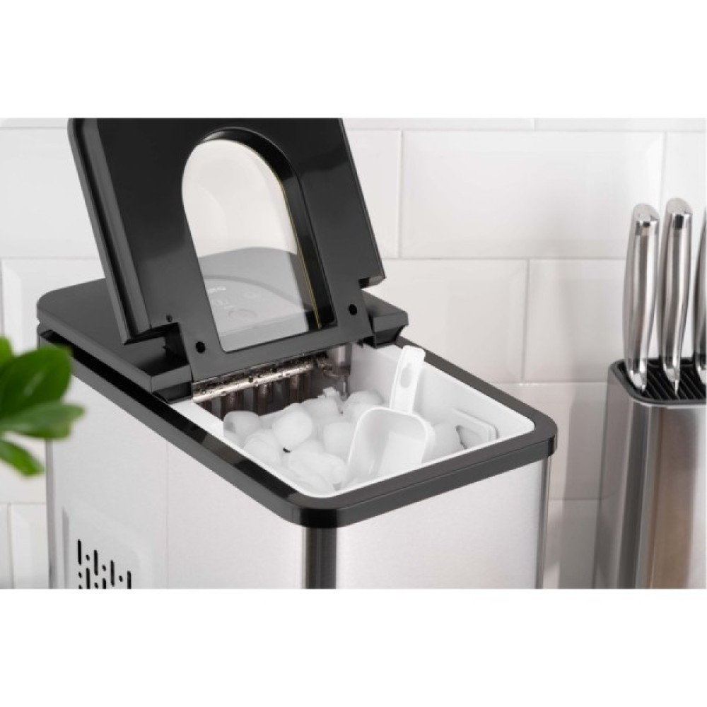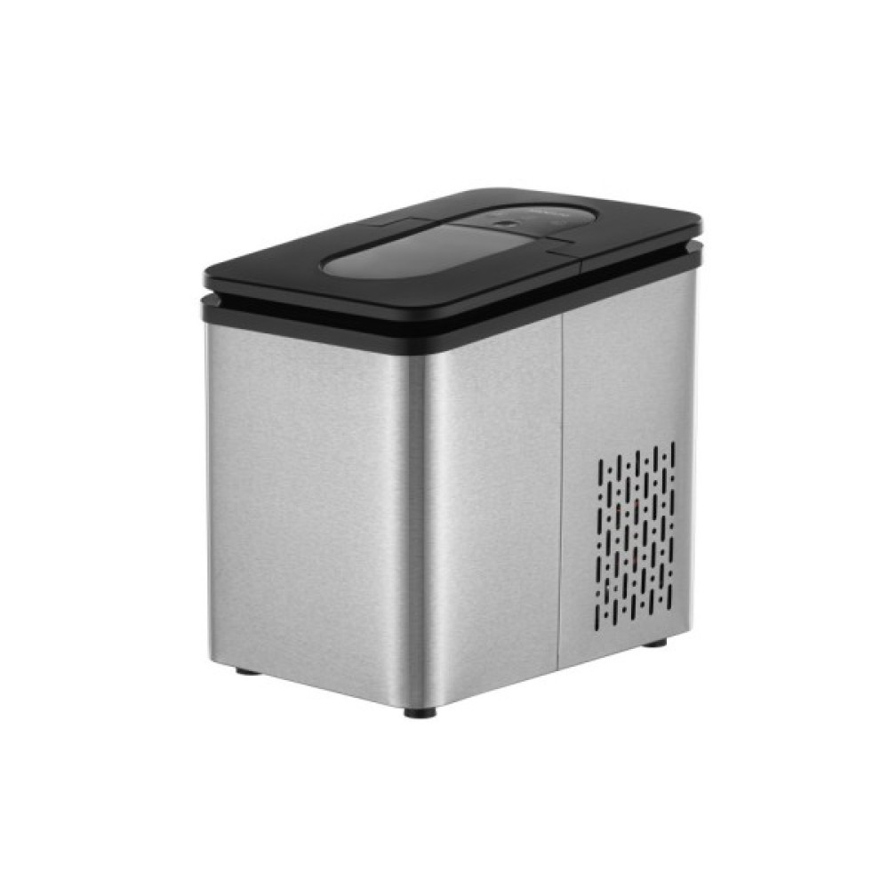 Корпус льодогенератора виконано з міцного полікарбонату.                                                                                                                                                                                                                                              На кришці розташоване прозоре віконце, сенсорна панель управління з індикаторами живлення, відсутності води та повного заповнення кошика. У комплекті поставки є спеціальна лопатка, а швидкий злив води реалізовано за допомогою клапана в нижній частині пристрою.
