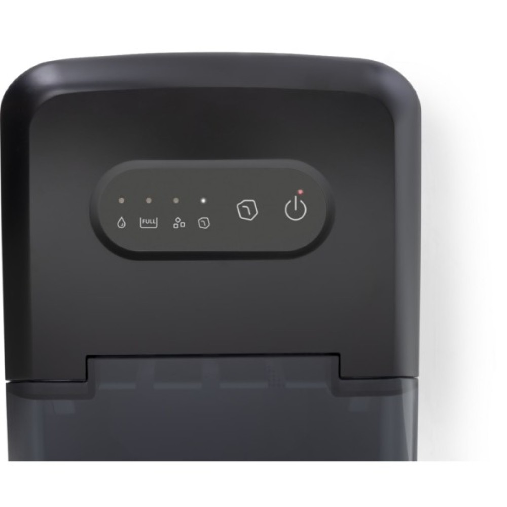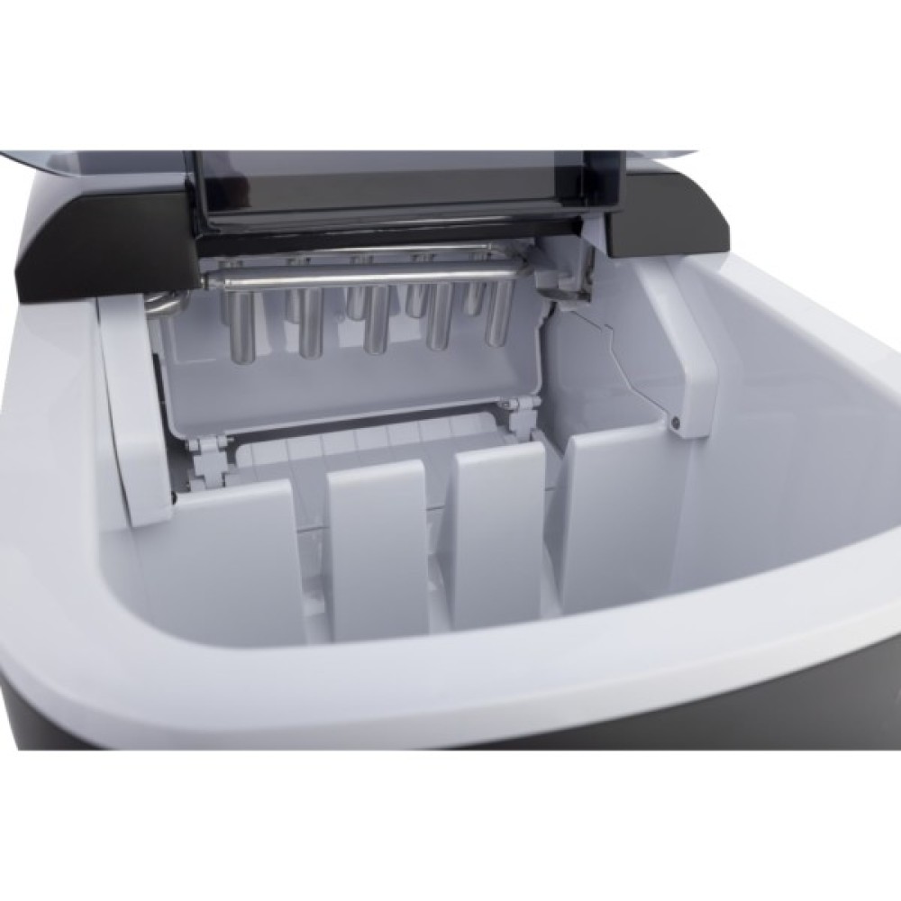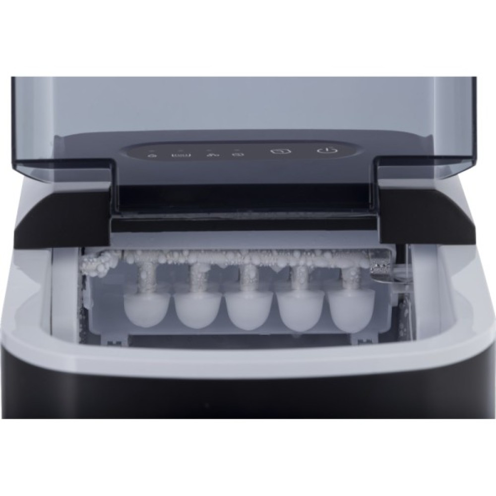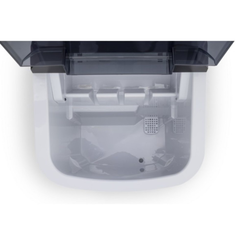 Льодогенератор оснащений резервуаром для води об’ємом 2,2 л та знімним контейнером для льоду, що значно спрощує використання. У комплект входить лопатка для льоду, яка дозволяє легко і гігієнічно роздавати готові кубики. Для обслуговування передбачено зливний отвір, завдяки якому процес очищення займає мінімум часу.