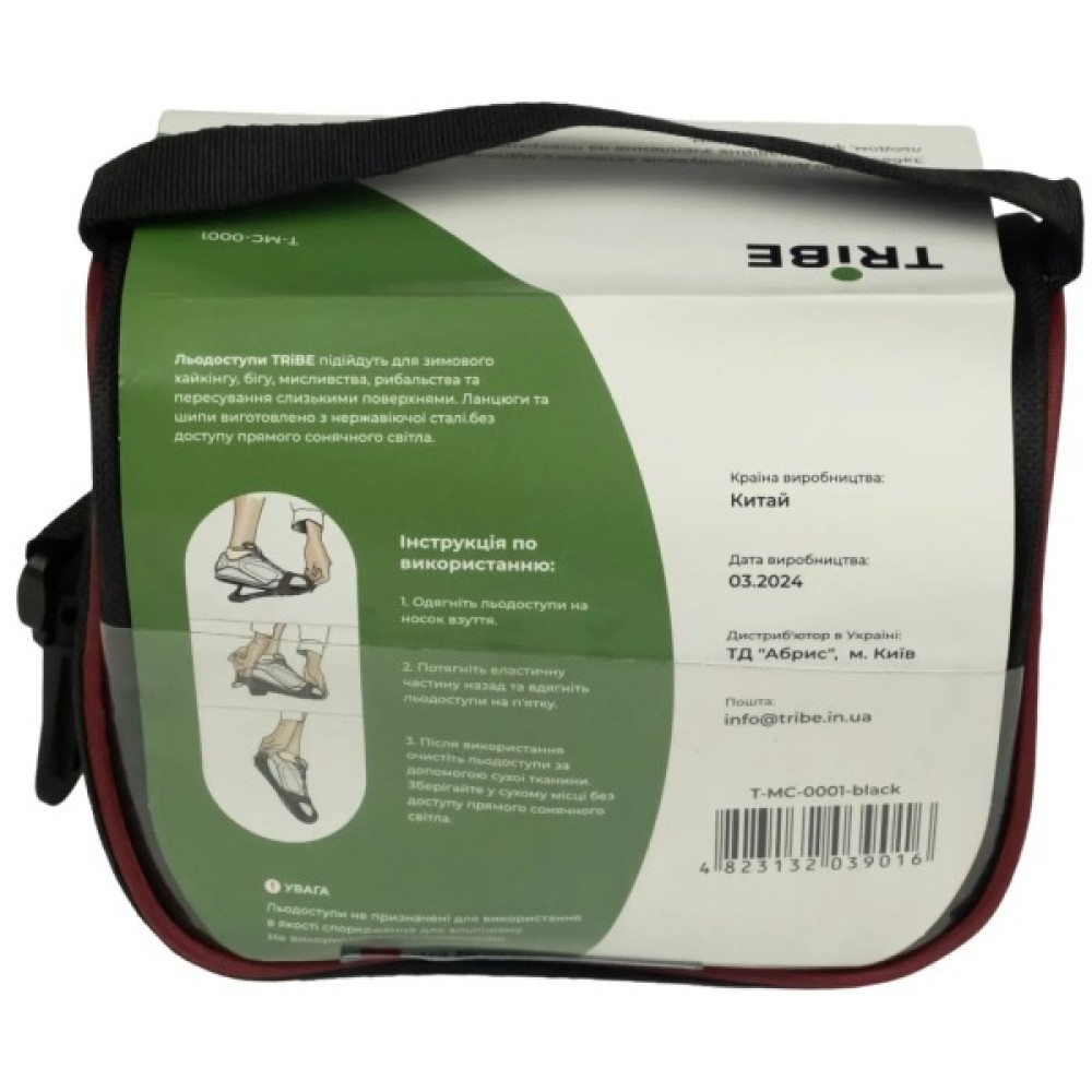 Льодоступи Tribe Ice підходять для використання на зледенілих ділянках в місті, під час зимового хайкінгу, бігу, рибальства та мисливства. Верх льодоступів виготовлено з еластичного матеріалу, який зручно одягати на різноманітне взуття. 17 зубців та ланцюги з нержавіючої сталі забезпечують надійне зчеплення на поверхнях покритих льодом та фірном.