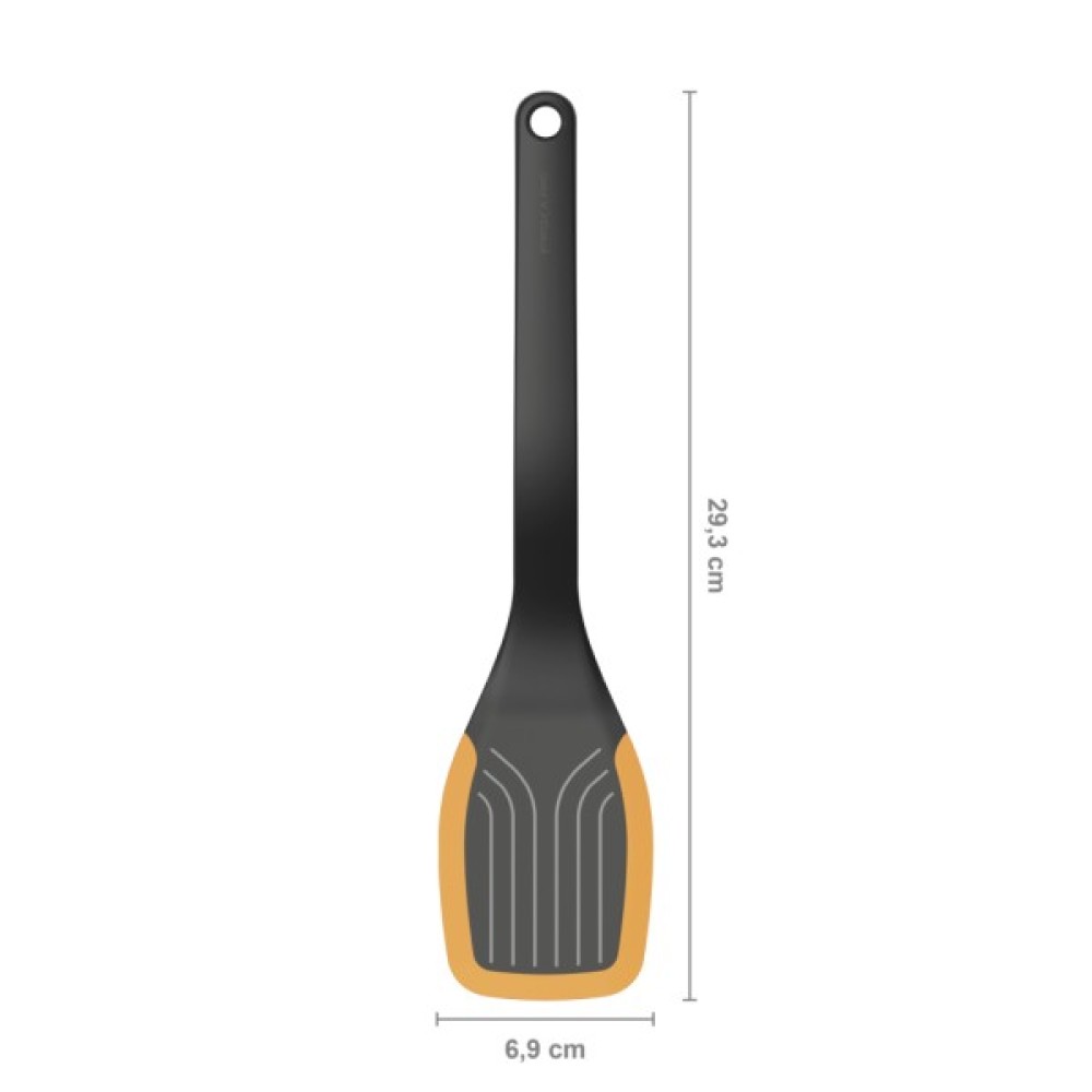 Лопатка Fiskars Functional Form з силіконовим рівним краєм - це нововведення в кухонних аксесуарах, виготовлена вона з нейлону найвищої міцності. Краї даної лопатки виконані із жаростійкого силікону, завдяки чому ви ефективно зберете страву навіть із гарячої сковороди. Не дряпає покриття сковороди, можна мити в посудомийній машині.