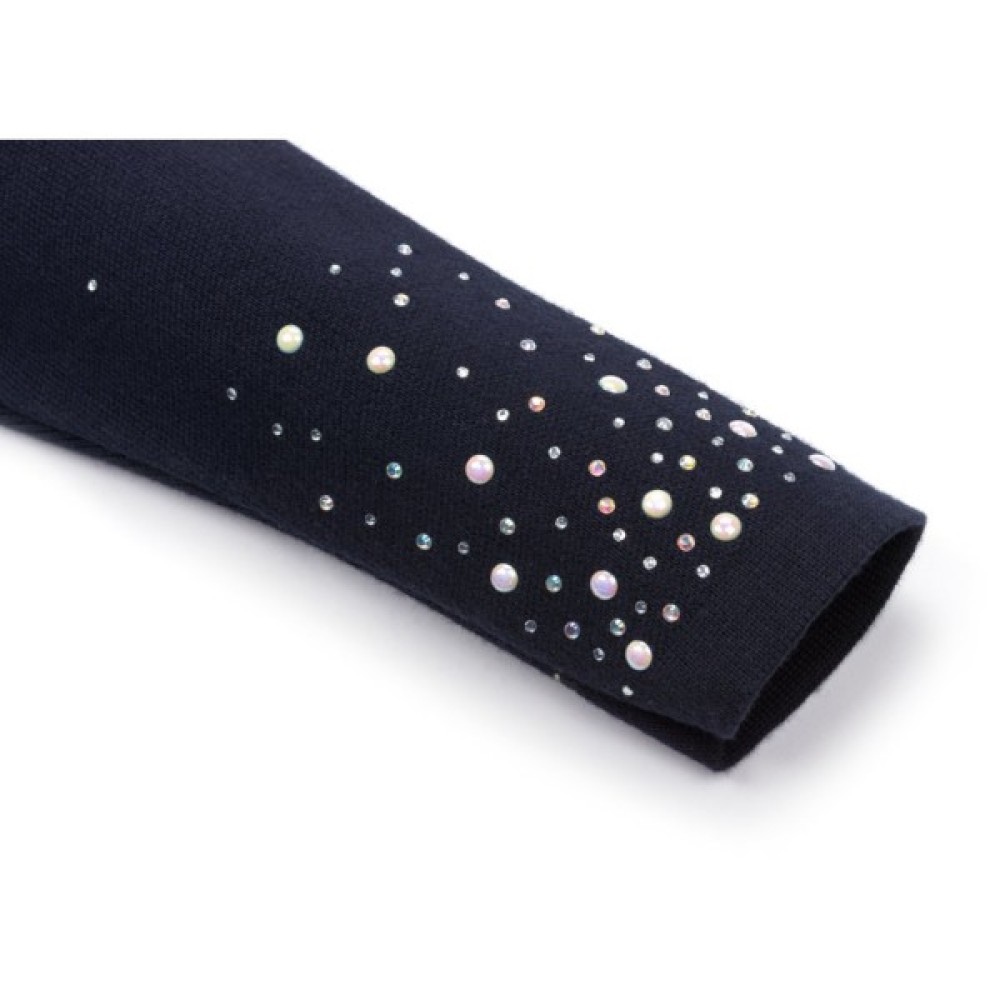 Шикарна новинка - чудові турецькі лосини темно-синього кольору, прикрашені внизу навколо райдужними переливчастими фарфоровими та скляними стразами. Щільна машинна в'язка - лицьова двостороння гладь та подвійна в'язана резинка в поясі забезпечать оптимальну посадку по фігурі.