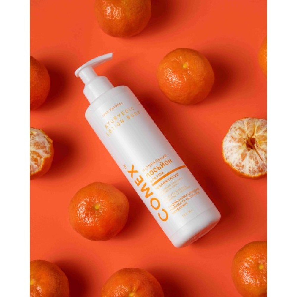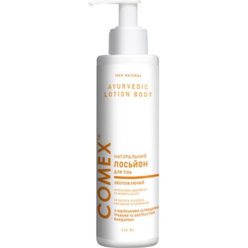Натуральний лосьйон для тіла Comex Зволоження та живлення на основі аюрведичних рецептів з екстрактами мандарина, органічного кокоса й індійських рослин. Ніжний лосьйон, що тане, моментально наповнює шкіру вологою й пахощами, пом'якшує огрубілі ділянки, знімає подразнення, зберігає пружність і молодість.
